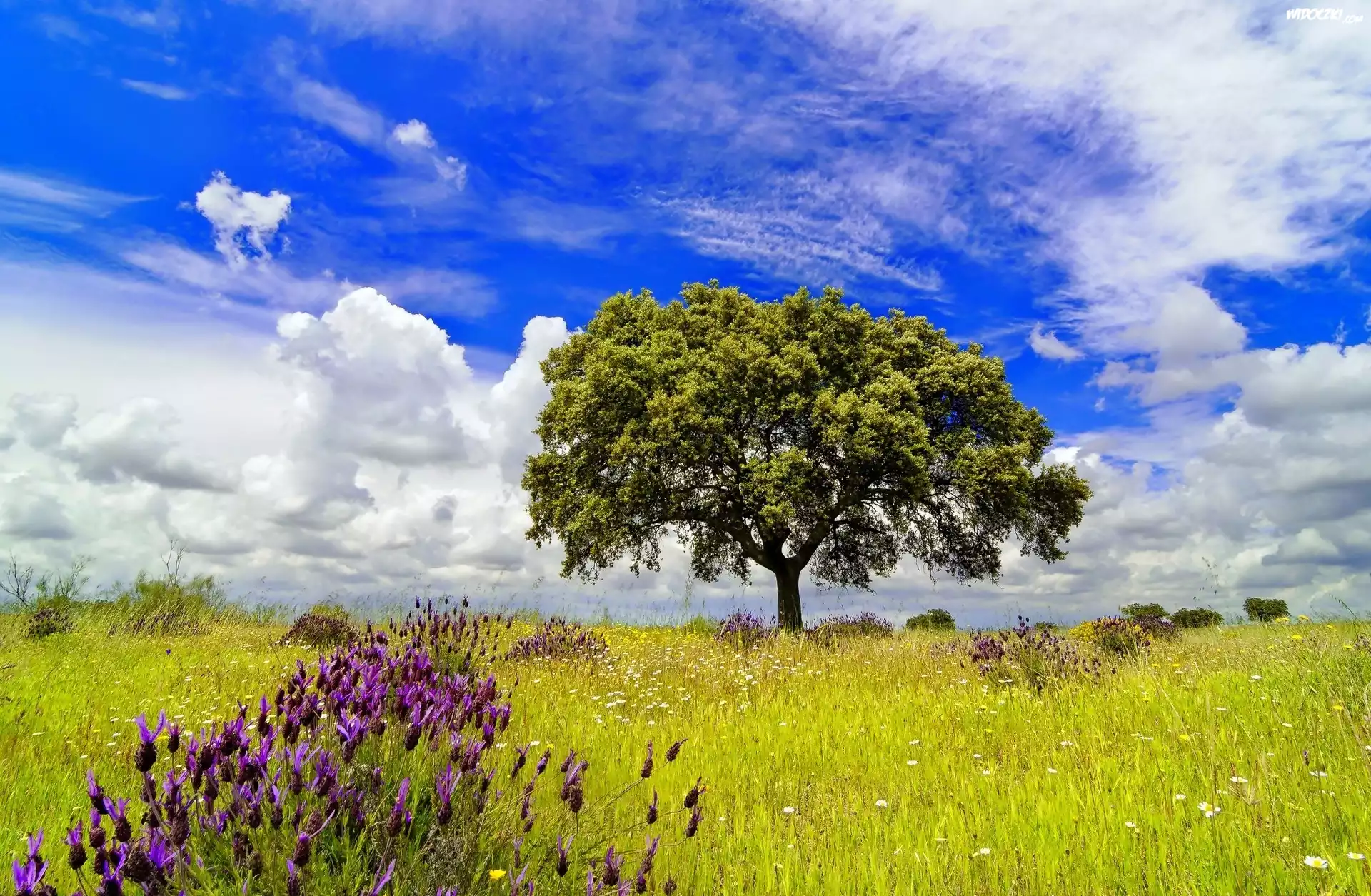 Samotne, Drzewo, Na, Łące, Kwiatki, Chmury