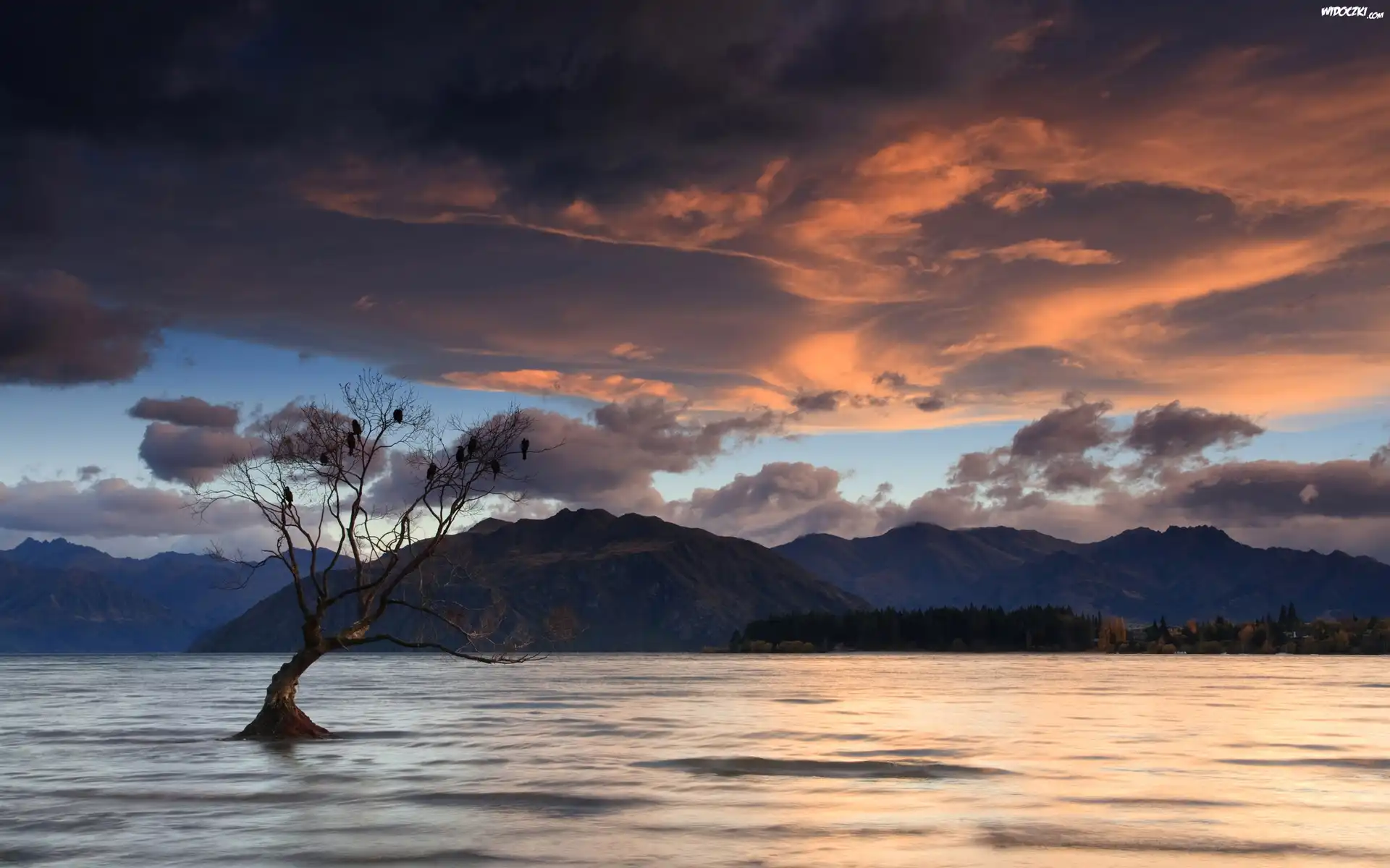 Zdjęcia, Woda, Samotne, Drzewo, Ptaki, Zachód, Słońca, Wzgórza