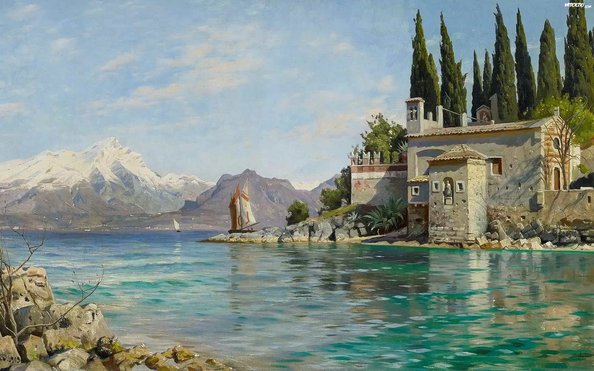 Malarstwo, Peder Monsted, Punta San Vigilio, Jezioro Garda, Włochy, Góry, Żaglówki, Drzewa, Dom, Skały |