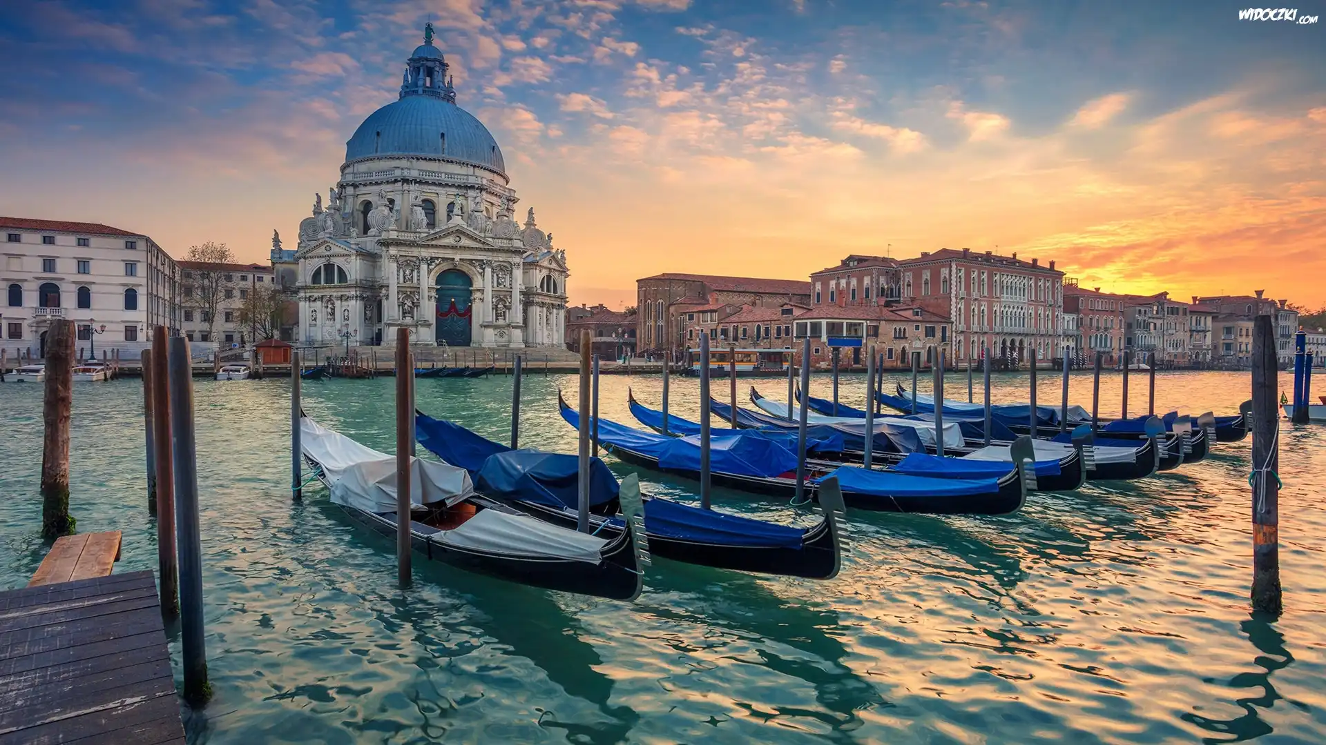 Zdjęcia, Włochy, Wenecja, Canal Grande, Bazylika Santa Maria della Salute, Łodzie, Wschód słońca