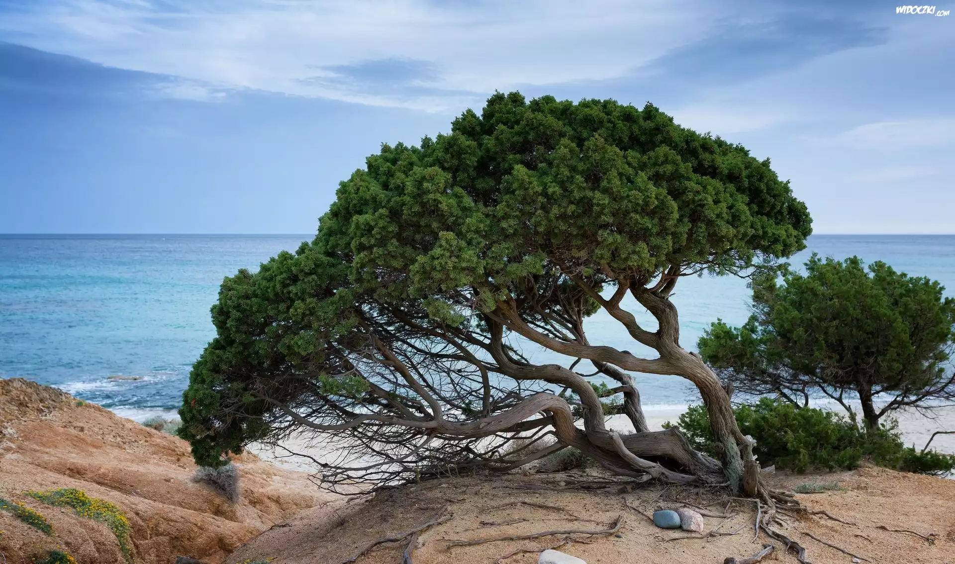 Zdjęcia, Włochy, Sardynia, Drzewa, Jałowce, Skały, Morze Tyrreńskie