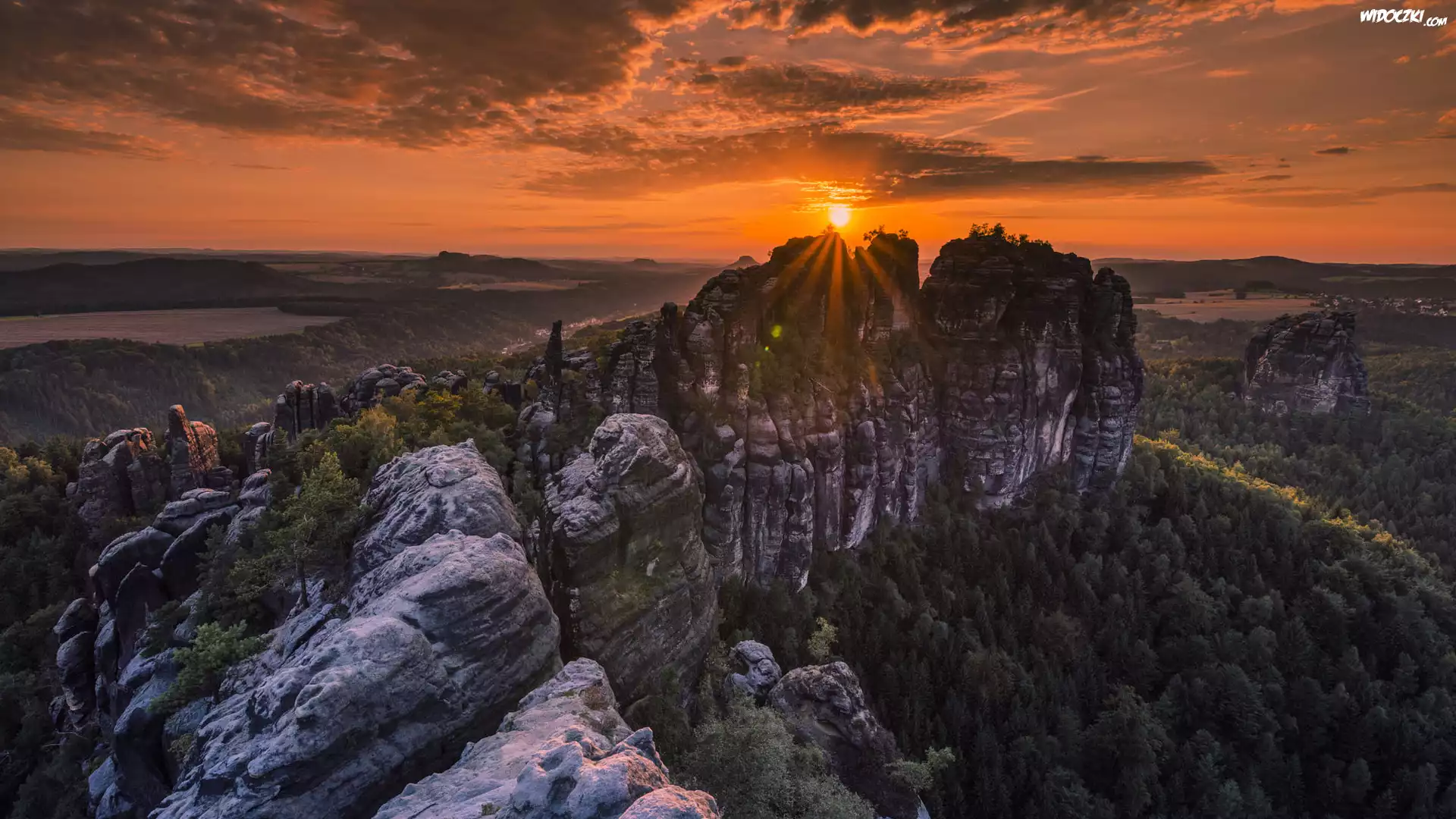 Zdjęcia, Niemcy, Saska Szwajcaria, Góry Połabskie, Drzewa, Promienie słońca