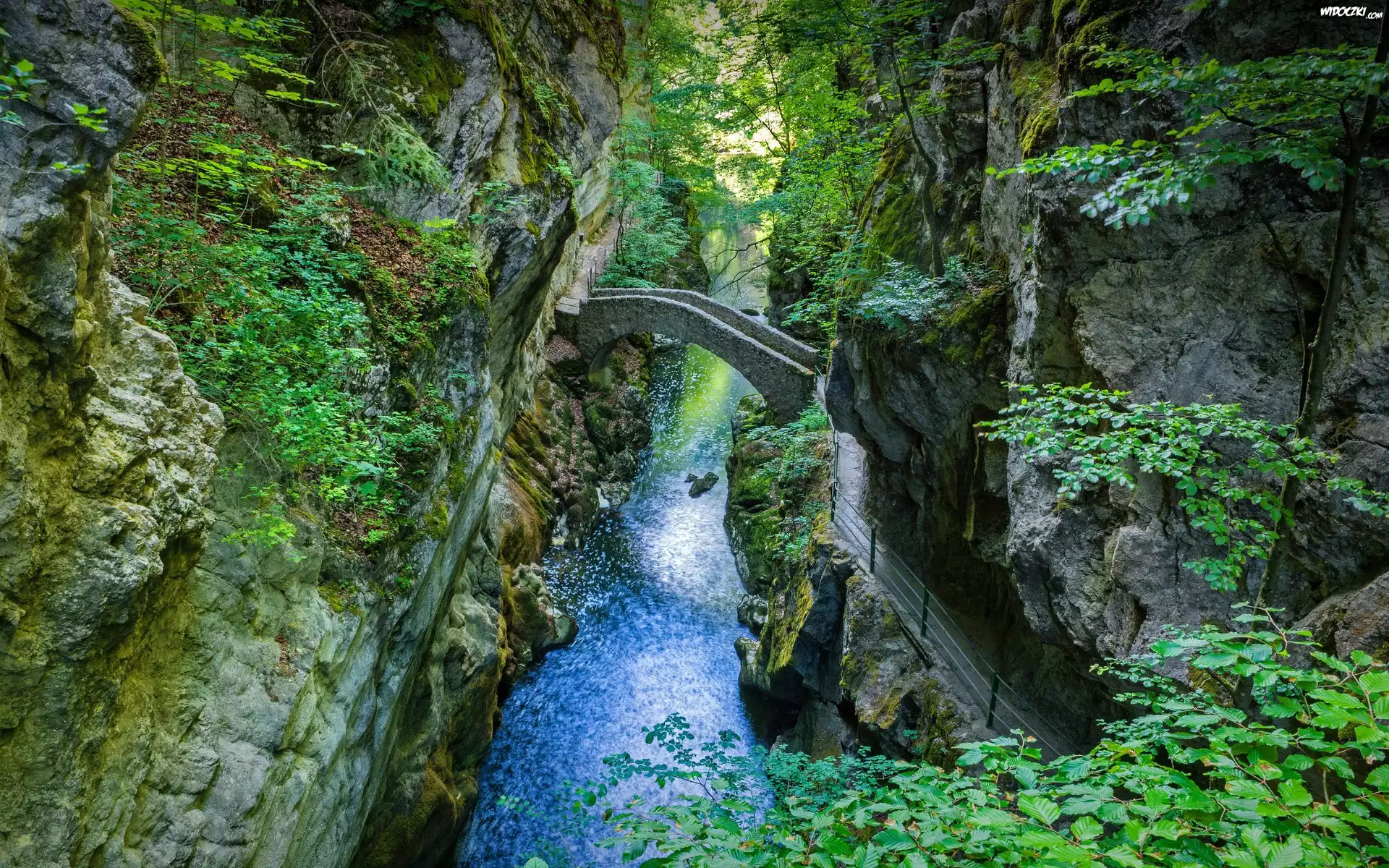 Zdjęcia, Szwajcaria, Kanton Neuchatel, Kamienny, Most, Saut de Brot, Skały, Rzeka Areuse, Wąwóz