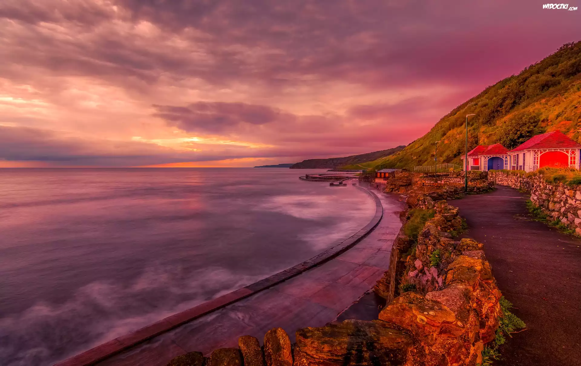 Morze Północne, Droga, Domki, Miasto Scarborough, Hrabstwo North Yorkshire, Anglia, Wschód słońca |