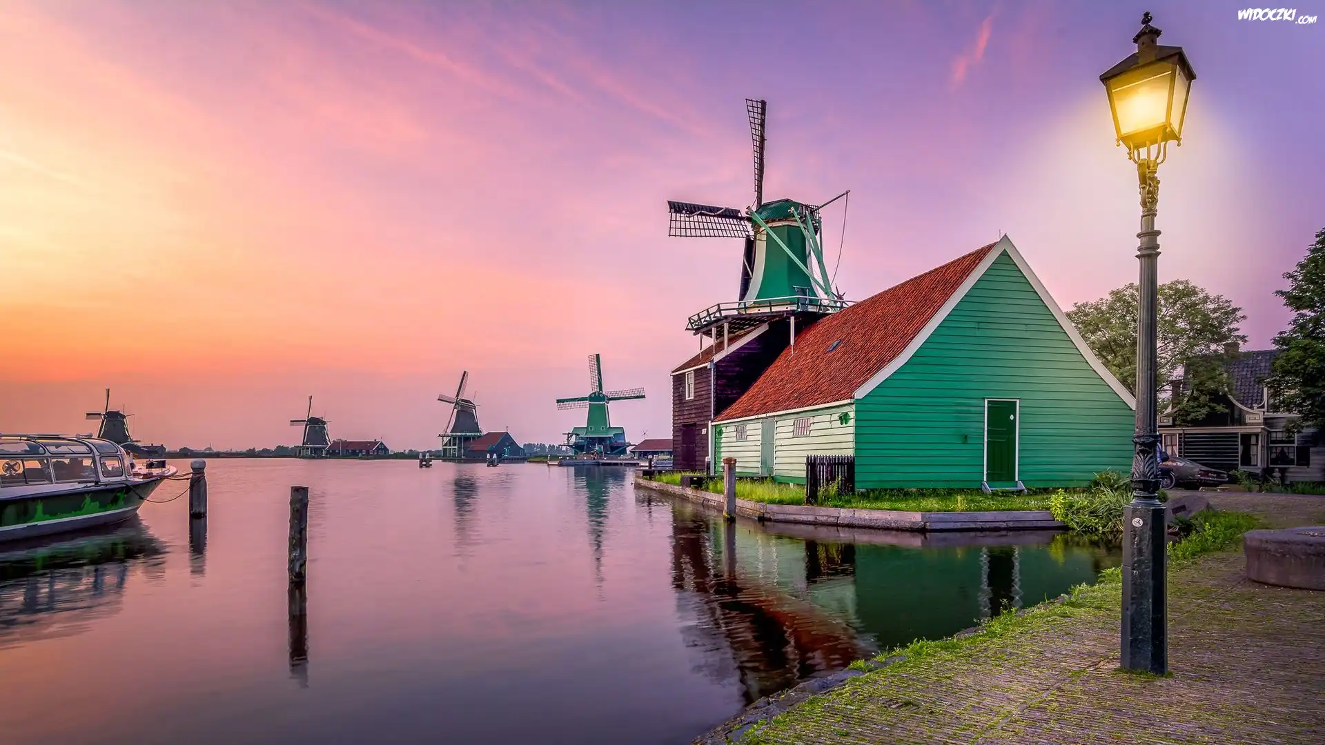 Zdjęcia, Rzeka, Wiatraki, Zachód słońca, Domy, Latarnia, Łódź, Skansen Zaanse Schans, Zaandam, Holandia