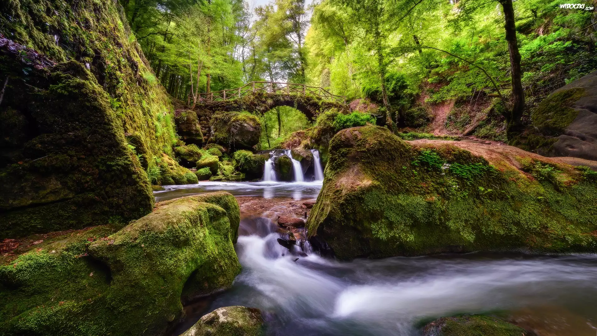 Zdjęcia, Las, Wodospad Schiessentumpel, Rzeka, Most, Skały, Drzewa, Mała Szwajcaria, Mullerthal, Luksemburg