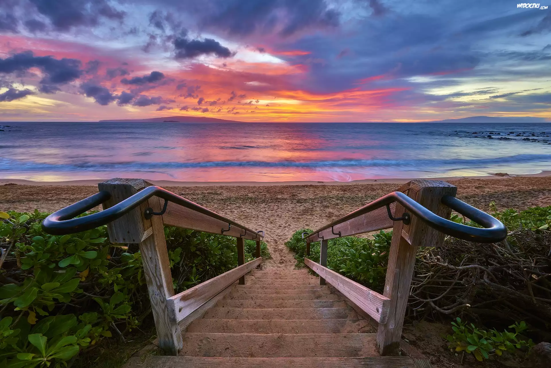 Schody, Plaża, Morze, Zachód słońca