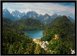Zdjęcia, Góry, Alpy, Jezioro, Jezioro Alpsee, Zamek Hohenschwangau, Domy, Gmina Schwangau, Bawaria, Niemcy
