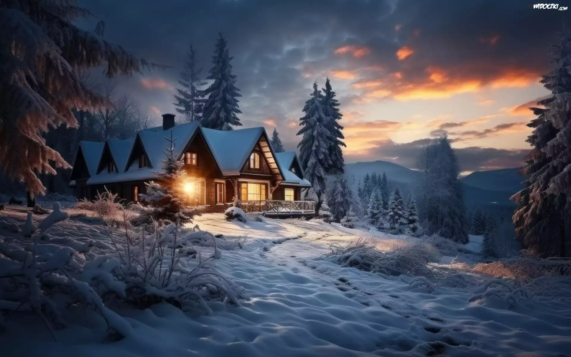 Zdjęcia, Zima, Las, Dom, Śnieg, Drzewa, Światła, Ścieżka, Góry, Wieczór, Chmury, Niebo