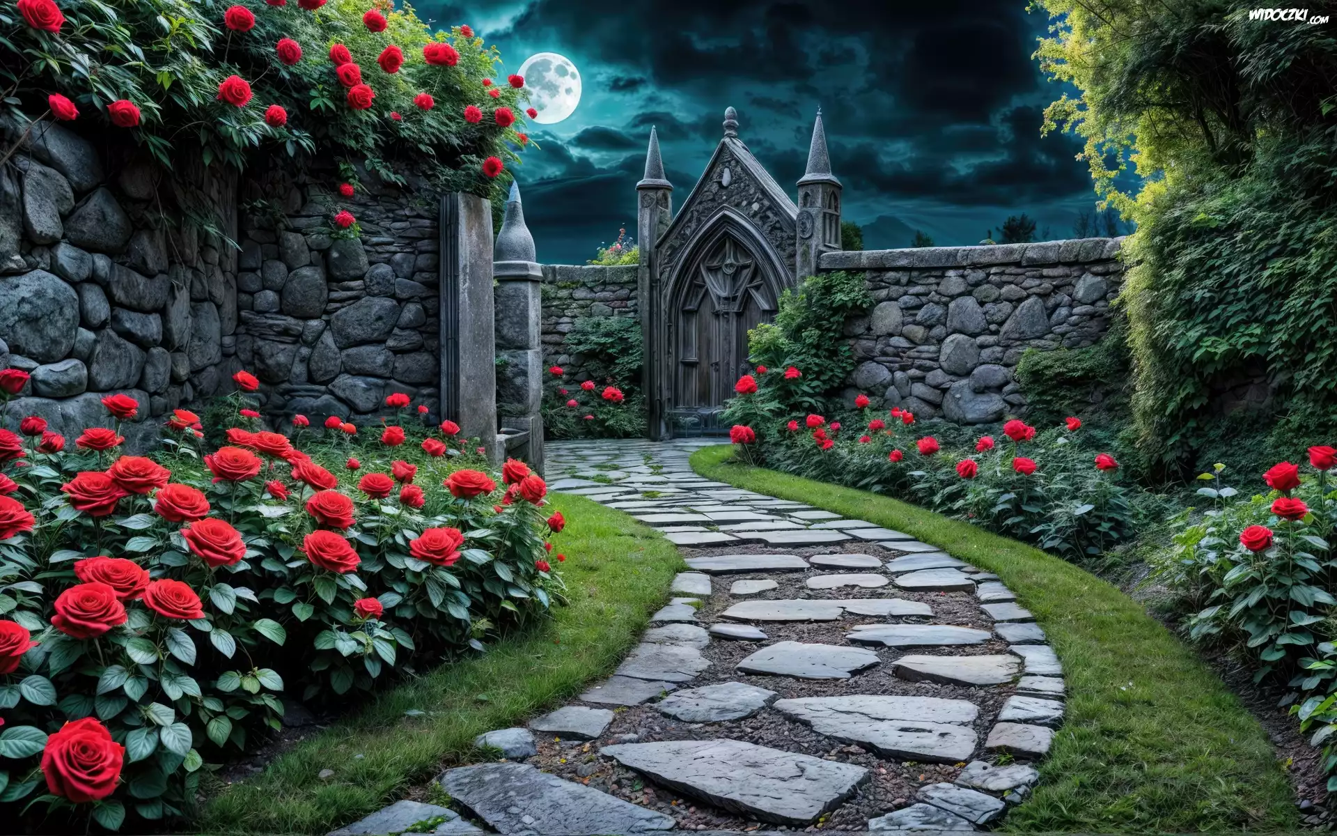 Zdjęcia, Róże, Ścieżka, Mur, Księżyc, Grafika