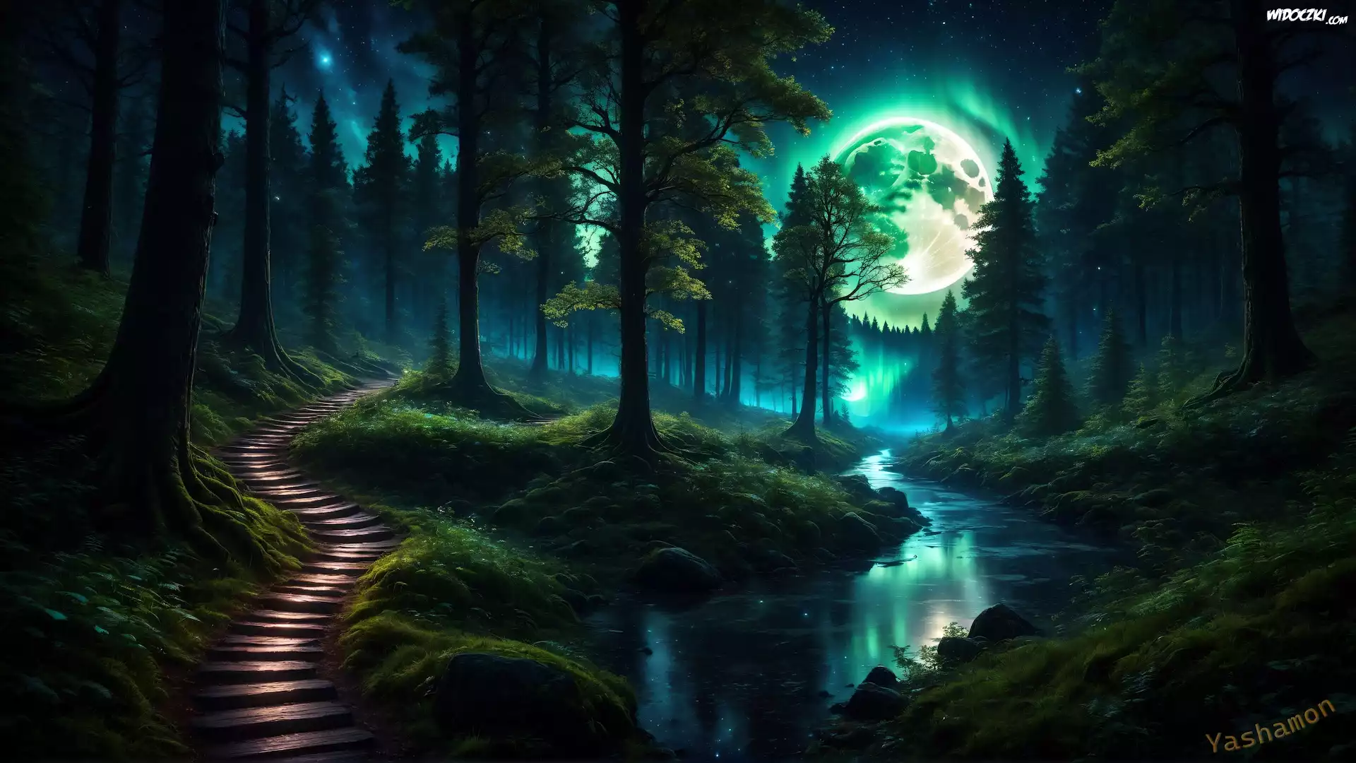 Zdjęcia, Grafika, Las, Rzeka, Ścieżka, Noc, Księżyc, Drzewa