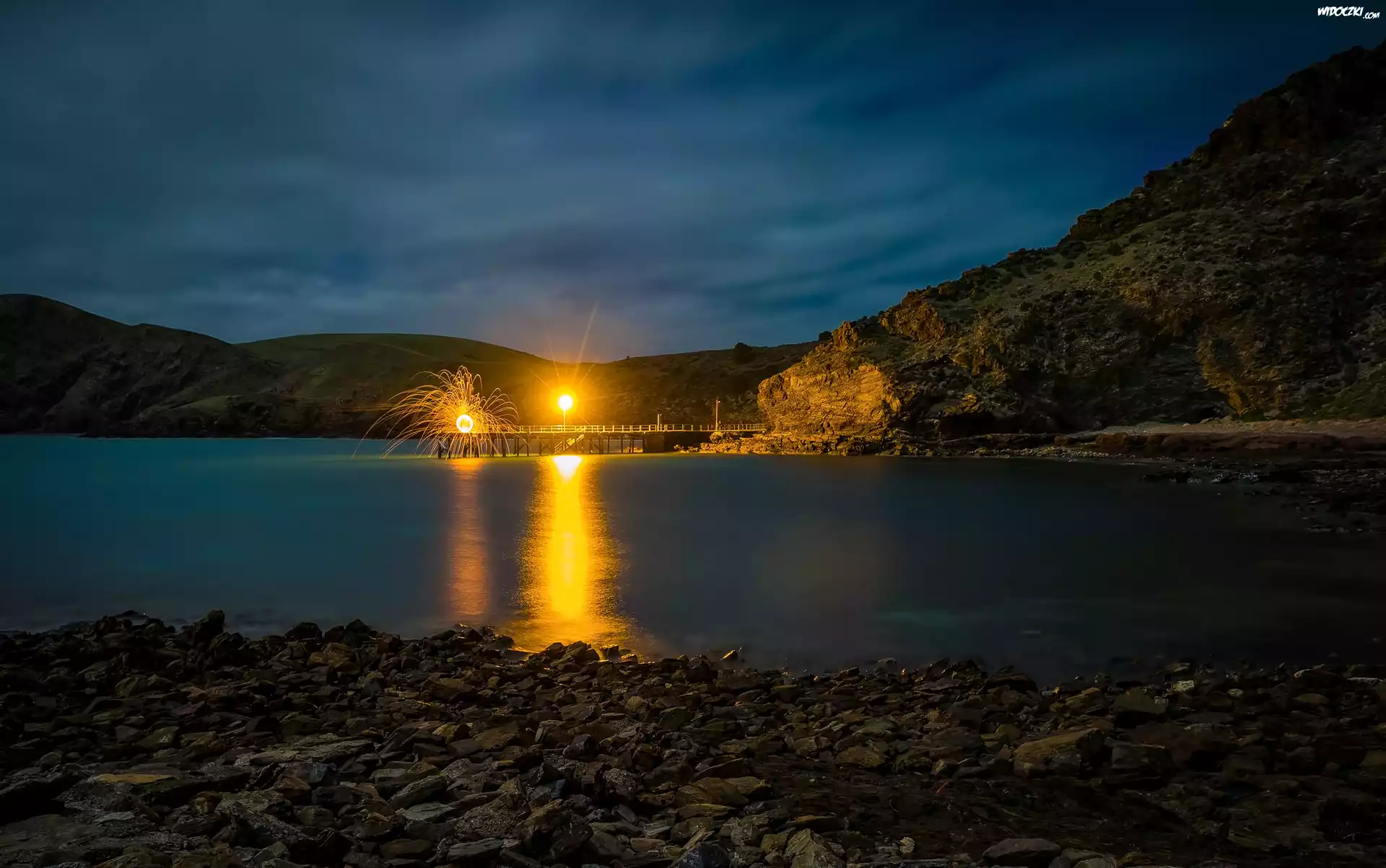 Zdjęcia, Australia, Second Valley, Morze, Kamienie, Molo, Noc, Światła