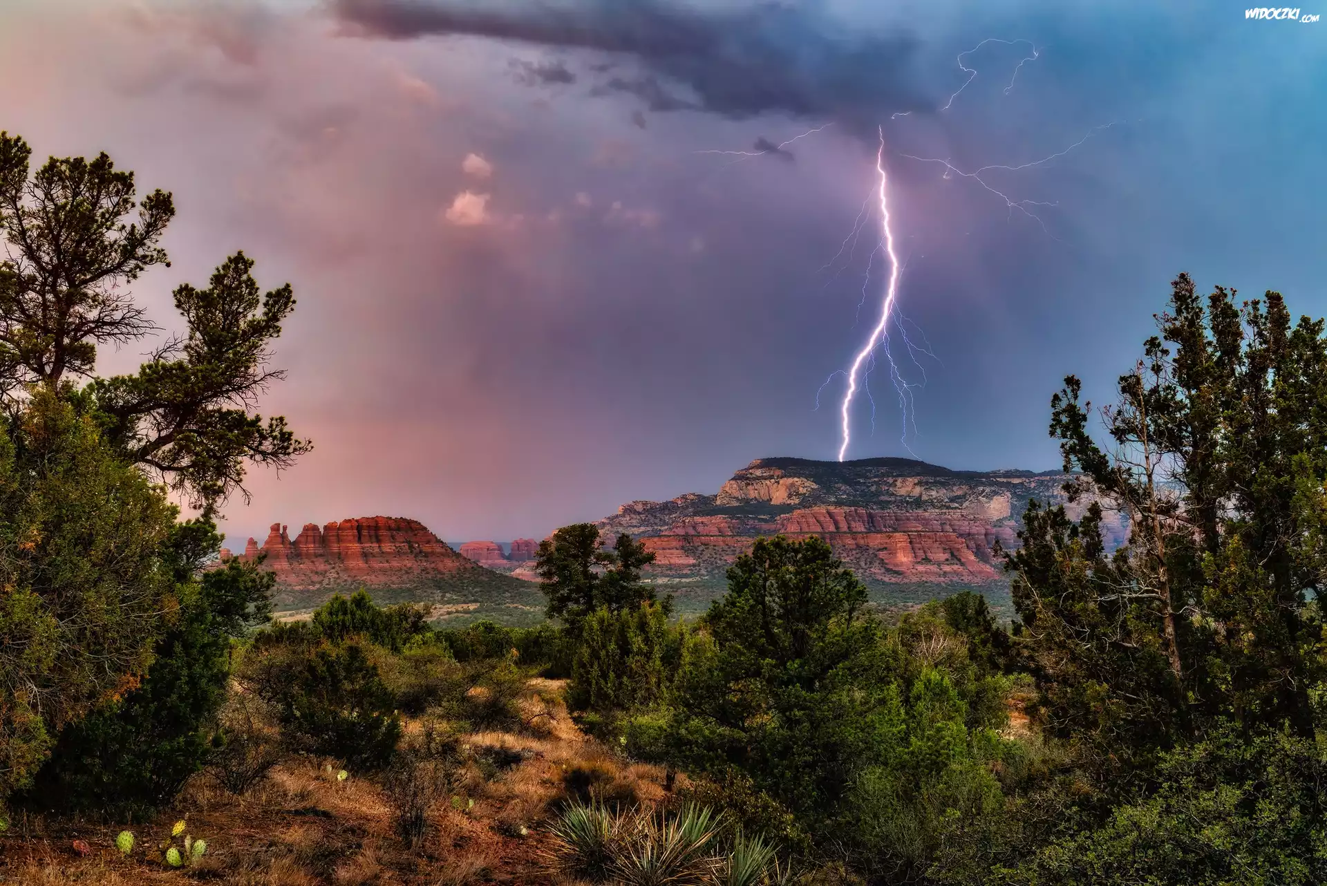Stany Zjednoczone, Arizona, Sedona, Góra, Bear Mountain, Skały, Drzewa, Chmury, Burza, Błyskawica, Piorun |
