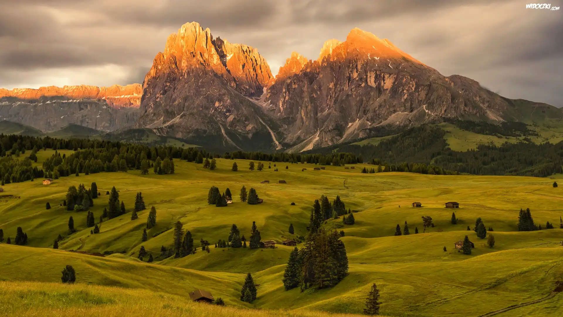Dolomity, Góry Sassolungo, Płaskowyż, Seiser Alm, Dolina, Val Gardena, Drzewa, Chmury, Drewniane, Domy, Włochy |