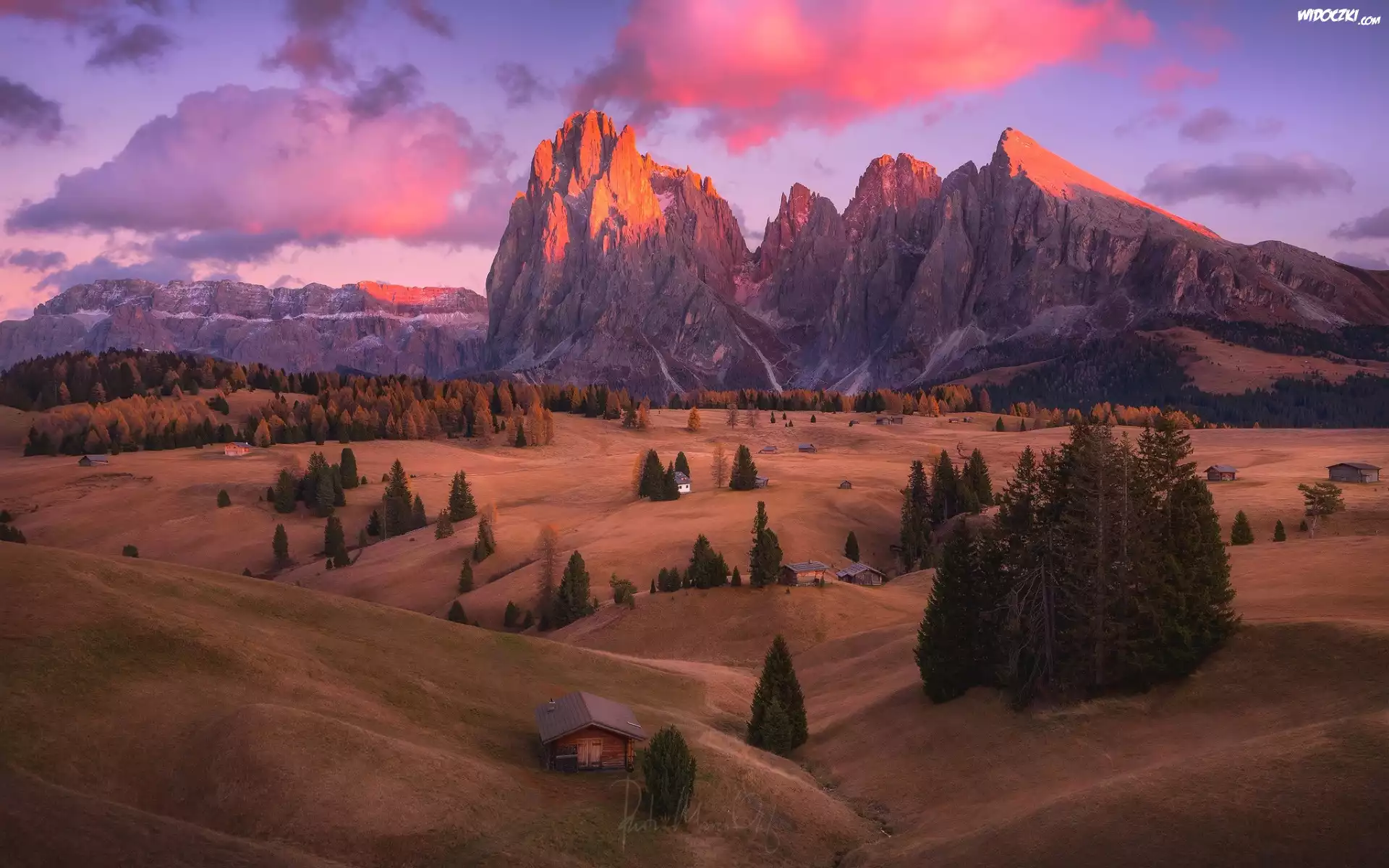 Góry Sassolungo, Dolomity, Płaskowyż Seiser Alm, Dolina Val Gardena, Wzgórza, Domy, Drzewa, Chmury, Włochy |