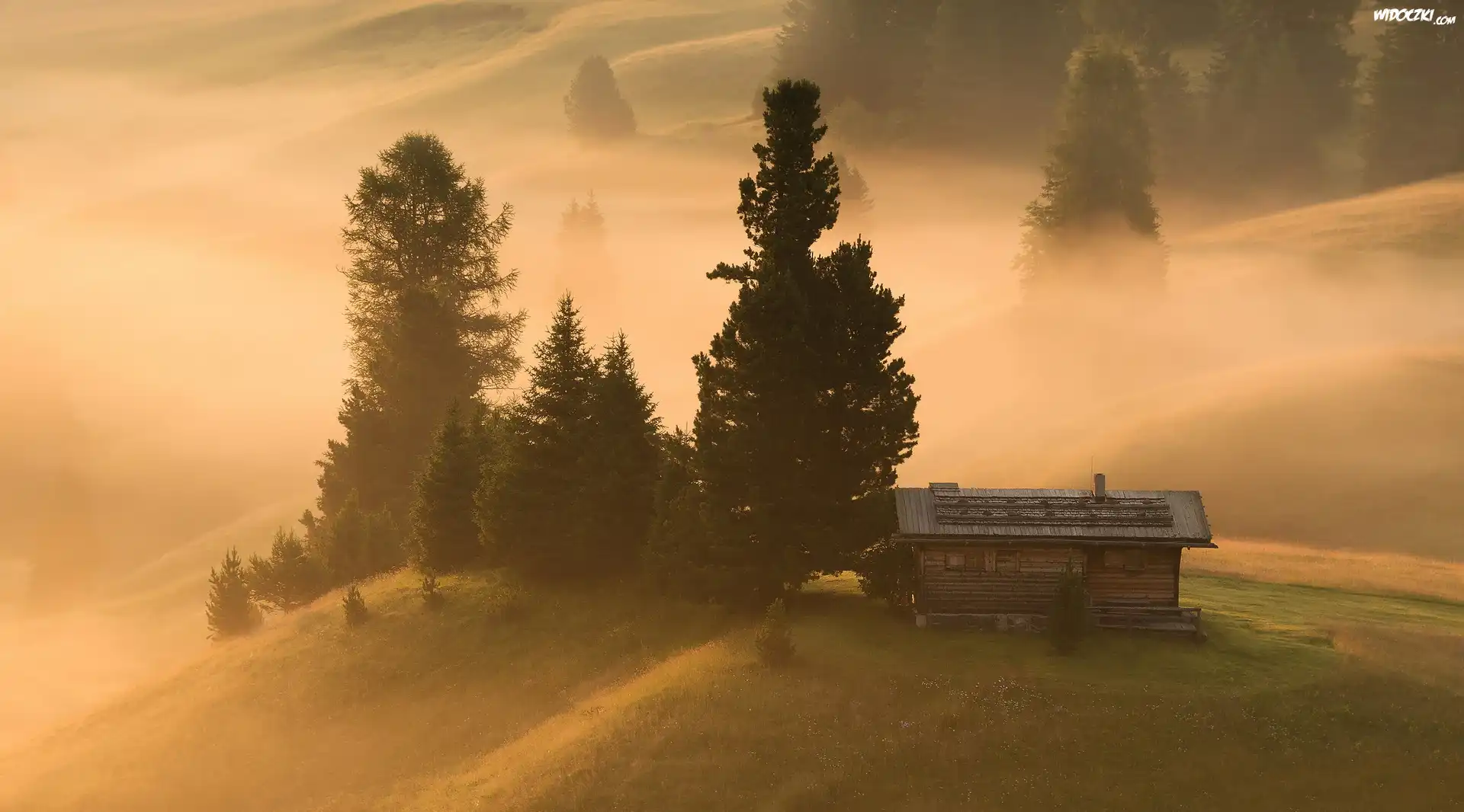 Zdjęcia, Płaskowyż Seiser Alm, Drewniany, Domek, Mgła, Drzewa, Włochy