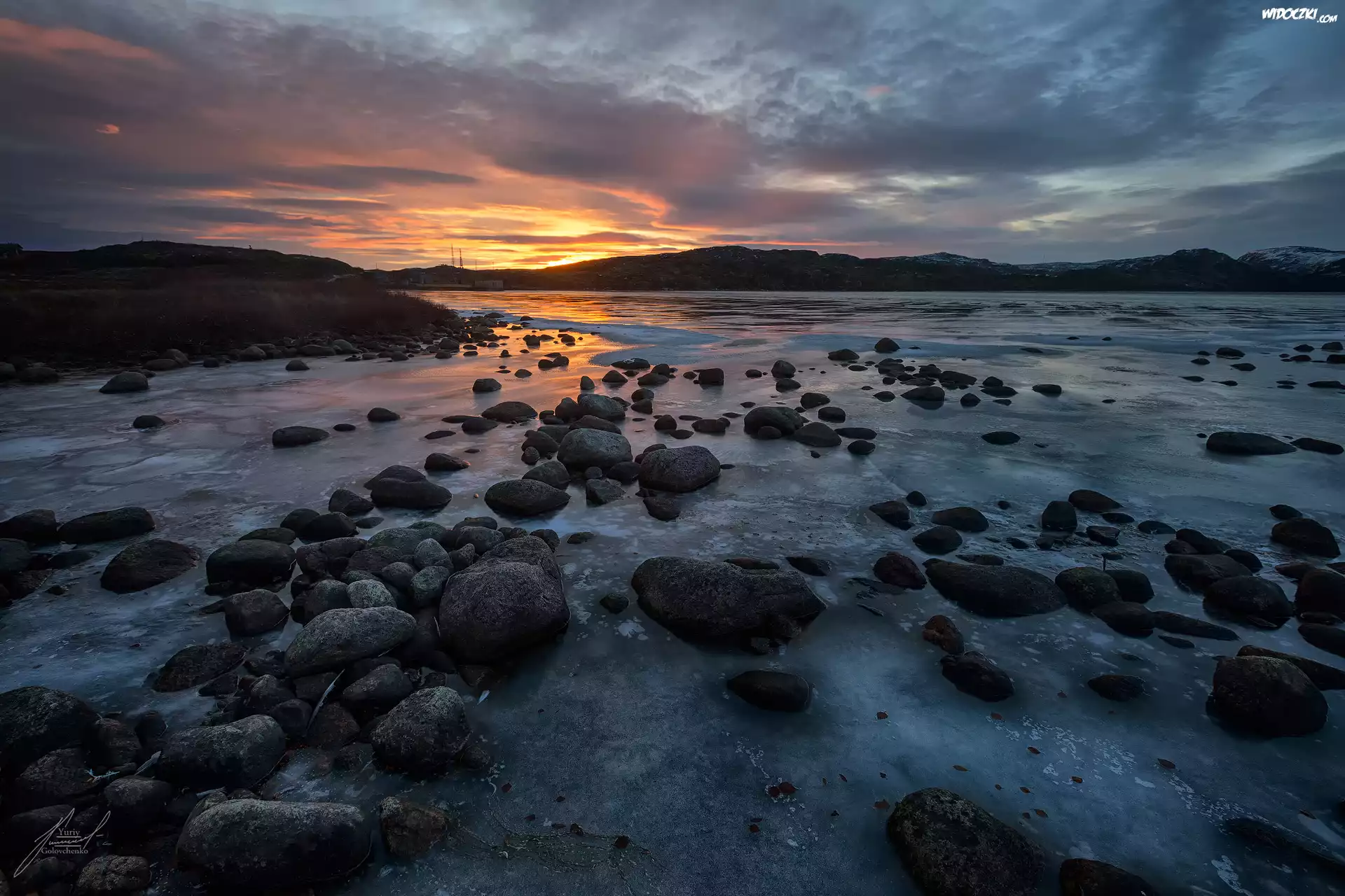 Teriberka, Jezioro Sekretarskoye, Kamienie, Lód, Chmury, Zachód słońca, Obwód murmański, Rosja |