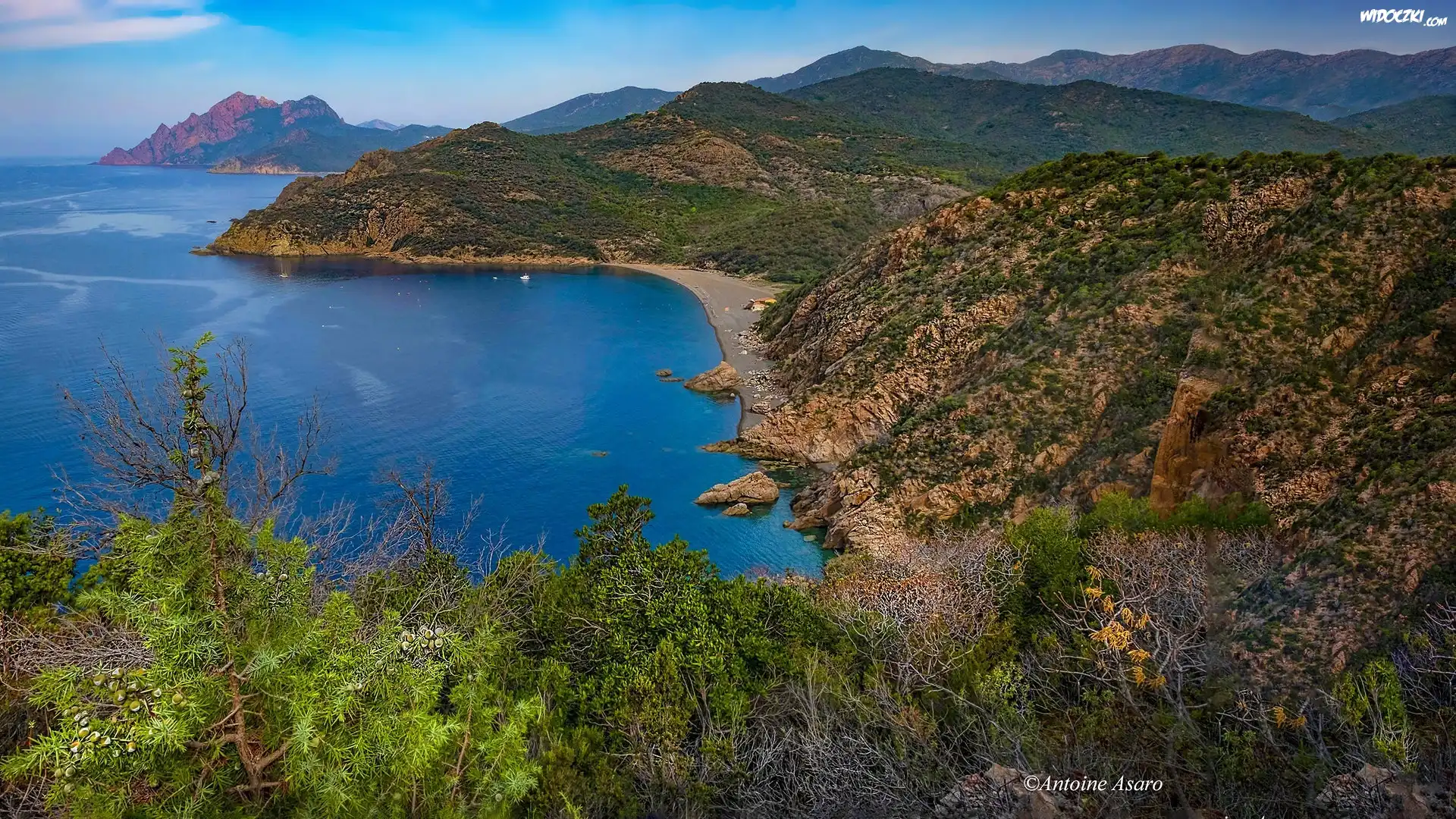 Zdjęcia, Góry, Morze, Zatoka, Golfe de Porto, Krzewy, Plaża Bussaglia, Serriera, Korsyka, Francja
