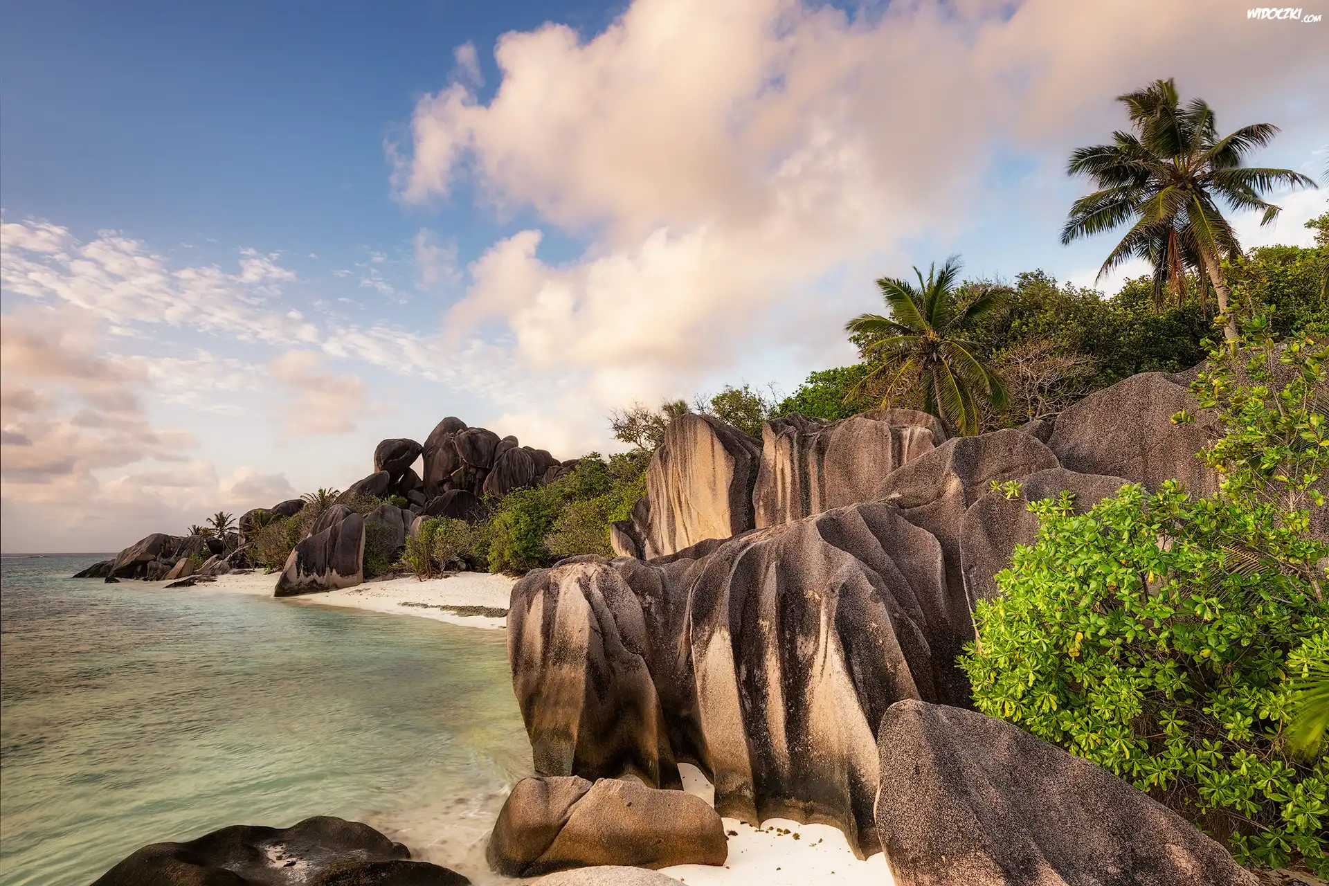 Zdjęcia, Wyspa La Digue, Morze, Skały, Głazy, Palmy, Roślinność, Chmury, Seszele