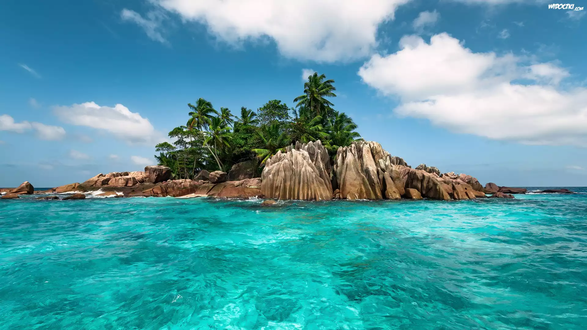 Zdjęcia, Morze, Ille Saint Pierre, Wyspa, Skały, Palmy, Tropiki, Chmury, Seszele