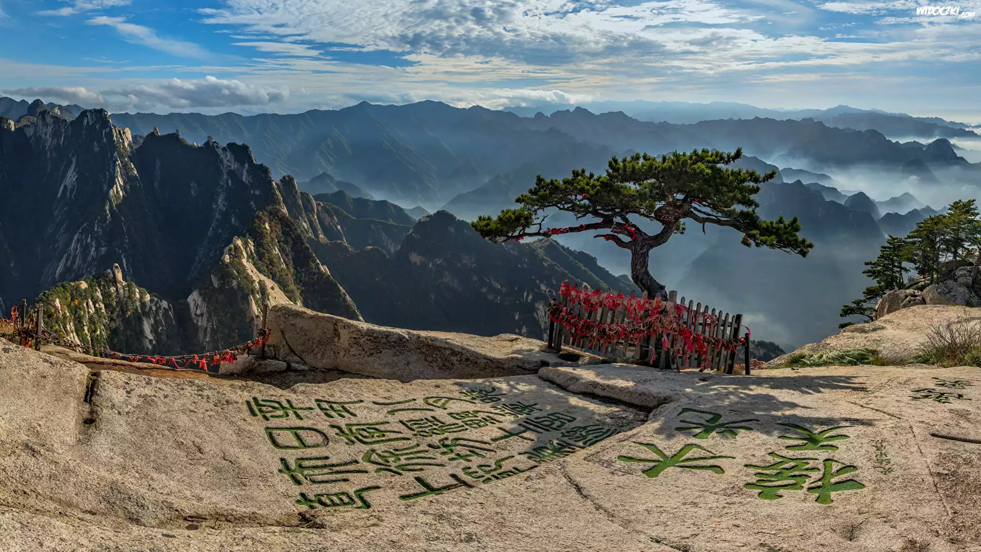 Zdjęcia, Chiny, Prowincja Shaanxi, Huayin, Góry, Mount Hua, Znaki, Sosna, Drzewa, Skały