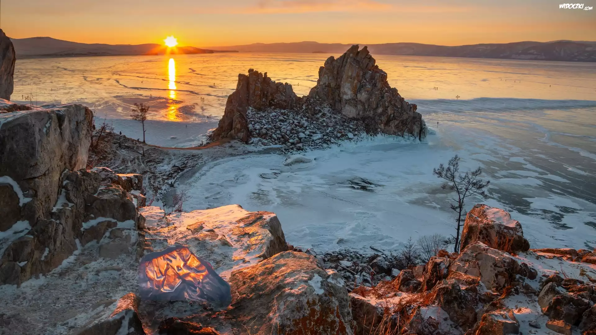 Wschód słońca, Jezioro, Bajkał, Nadbajkalski Park Narodowy, Skały, Skała, Shaman Rock, Rosja