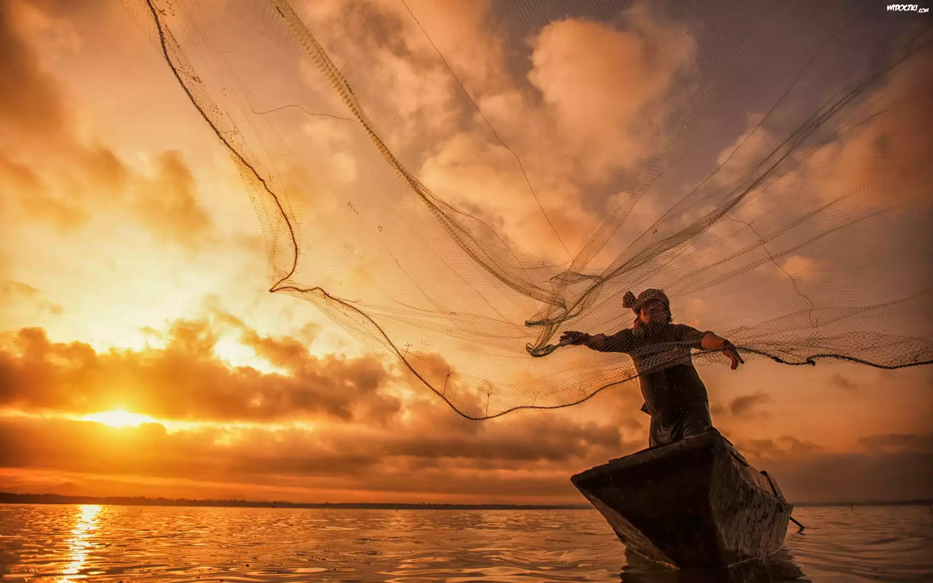 Rybak, Sieci, Jezioro, Łódz, Chmury, Wschód, Słońca