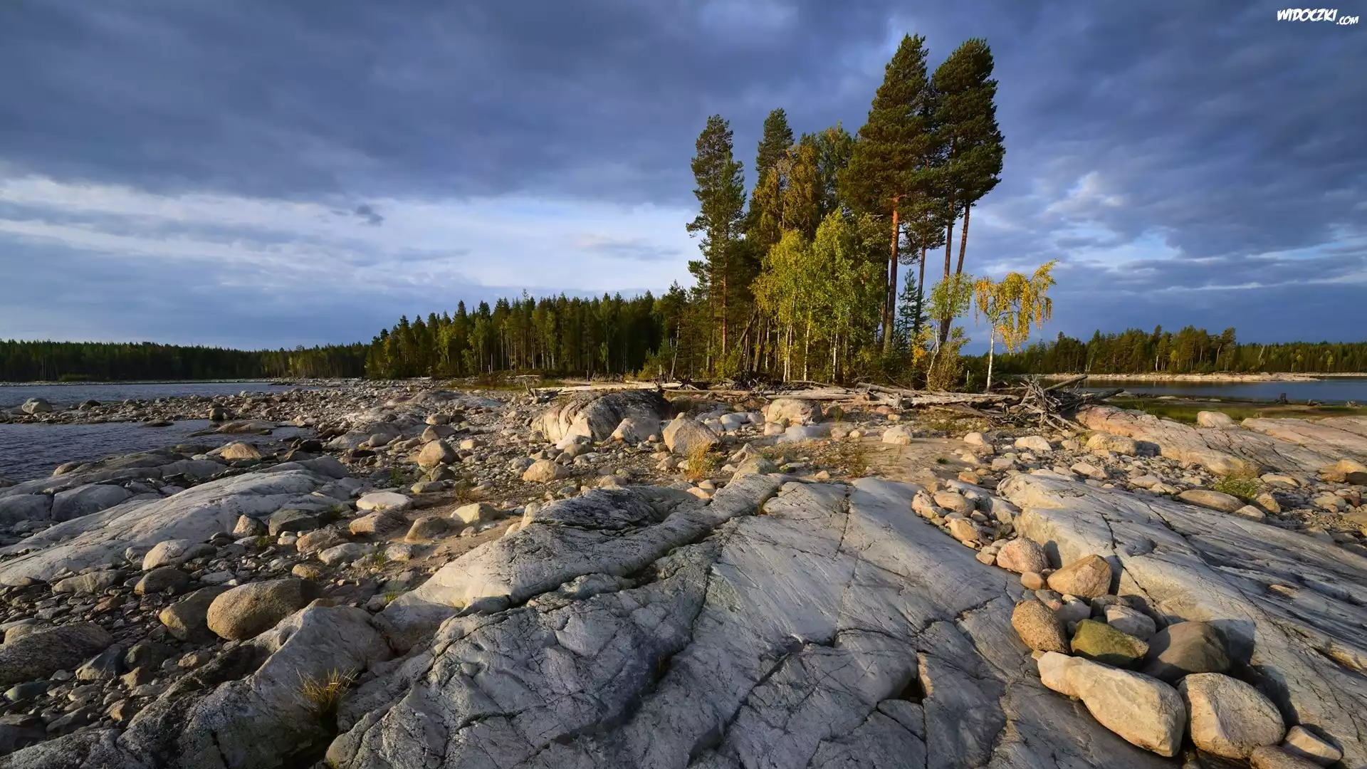 Zdjęcia, Jezioro Siegoziero, Skały, Kamienie, Drzewa, Karelia, Rosja