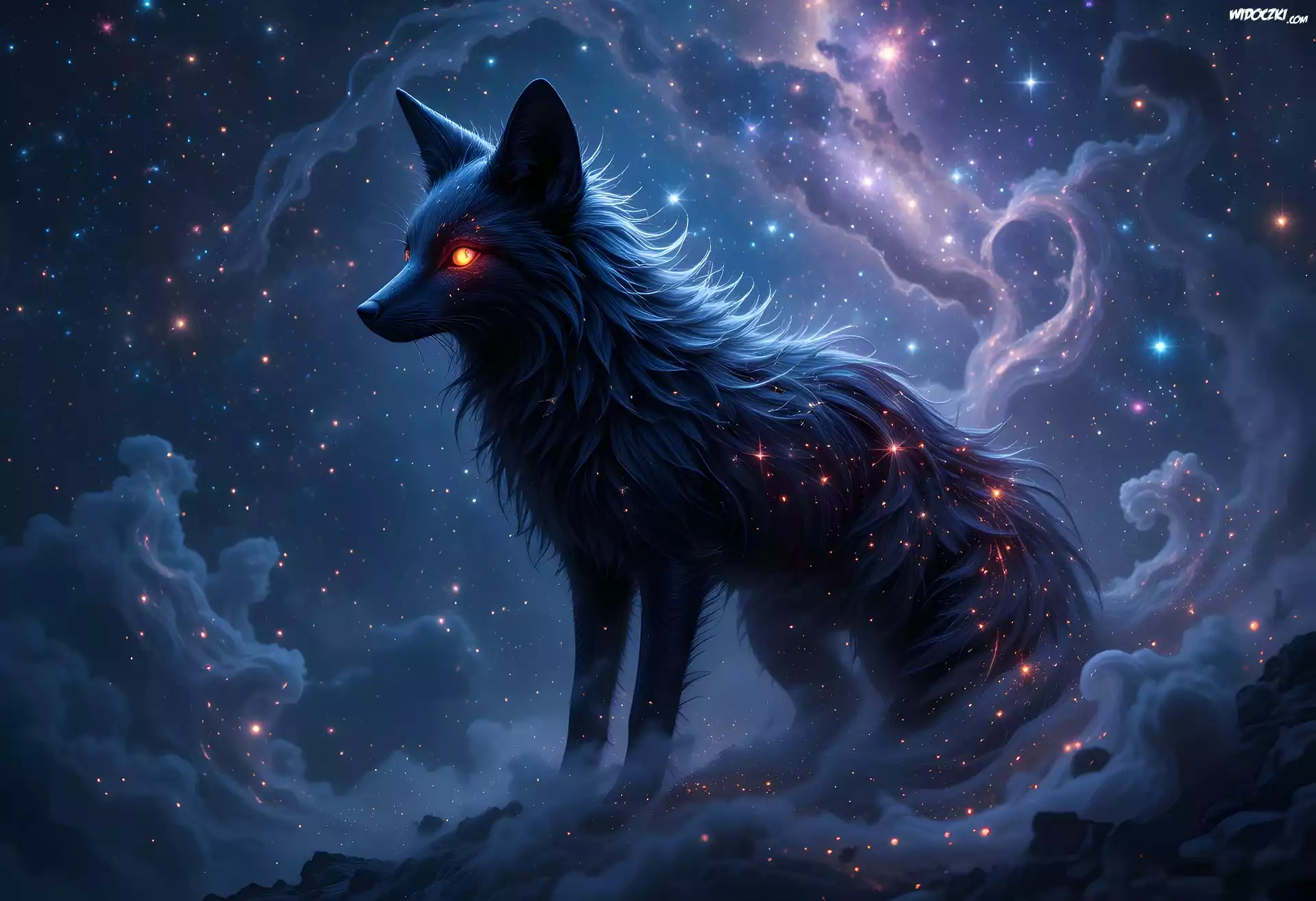 Ssak, Zwierzę, Dzikie, Drapieżne, Wilk, Czarny, Sierść, Światełka, Punkciki, Gwiazdki, Niebo, Chmury 3D, Wektorowa, 2D, Abstrakcja |