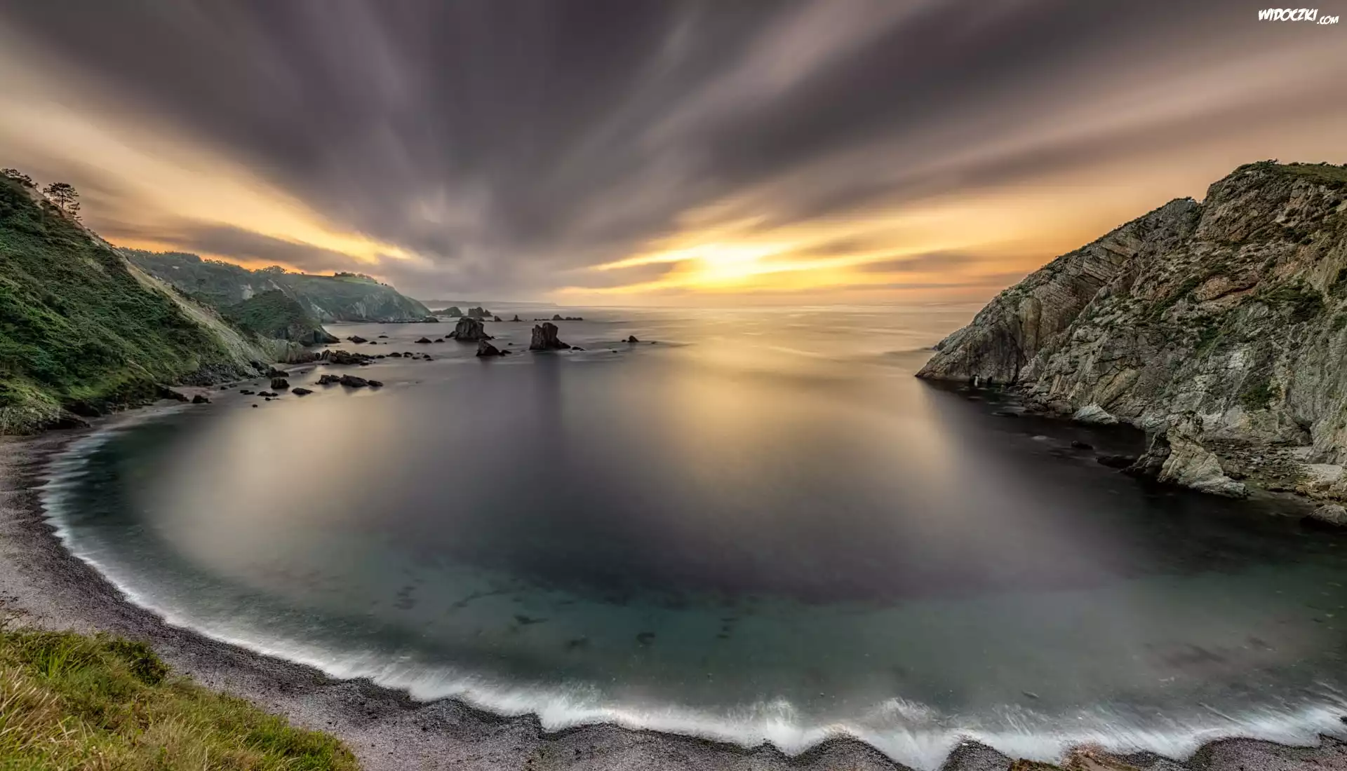 Zdjęcia, Morze, Zatoka, Zachód słońca, Skały, Wybrzeże, Plaża, Playa del Silencio, Asturia, Hiszpania