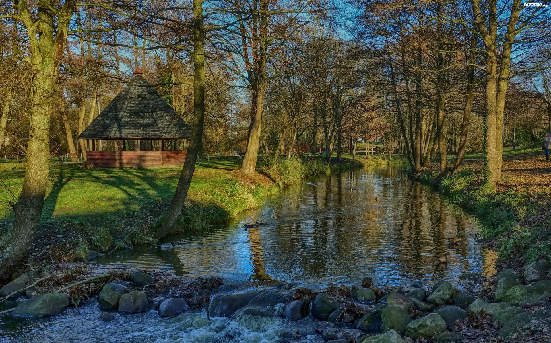 Zdj臋cia, Niemcy, Sittensen, Park, Rzeka Oste, Kamienie, Drzewa, Altanka