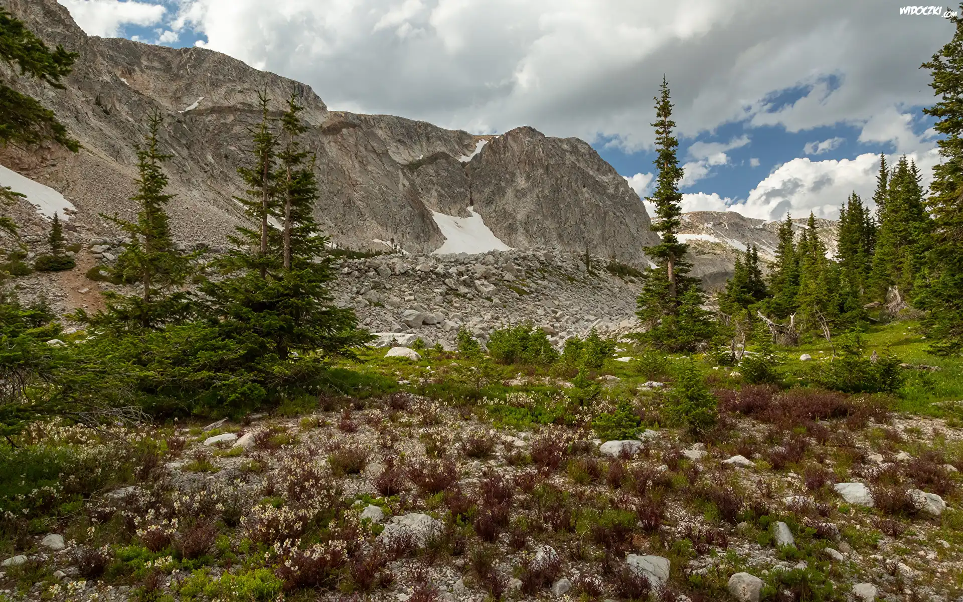 Zdjęcia, Skaliste, Góry, Kamienie, Drzewa, Chmury, Roślinność