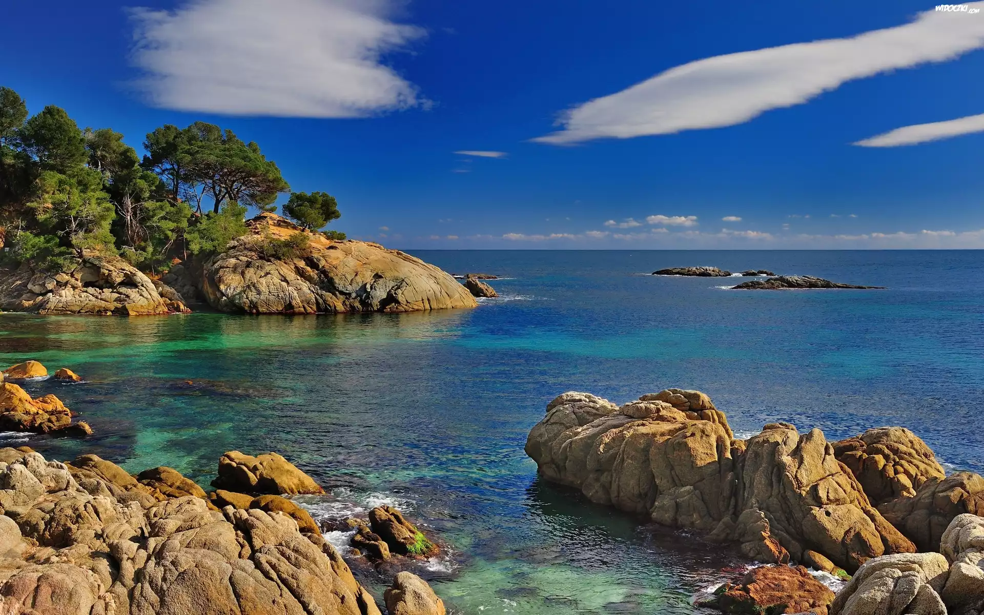 Zdjęcia, Skaliste, Wybrzeże, Morze, Kamienie, Drzewa