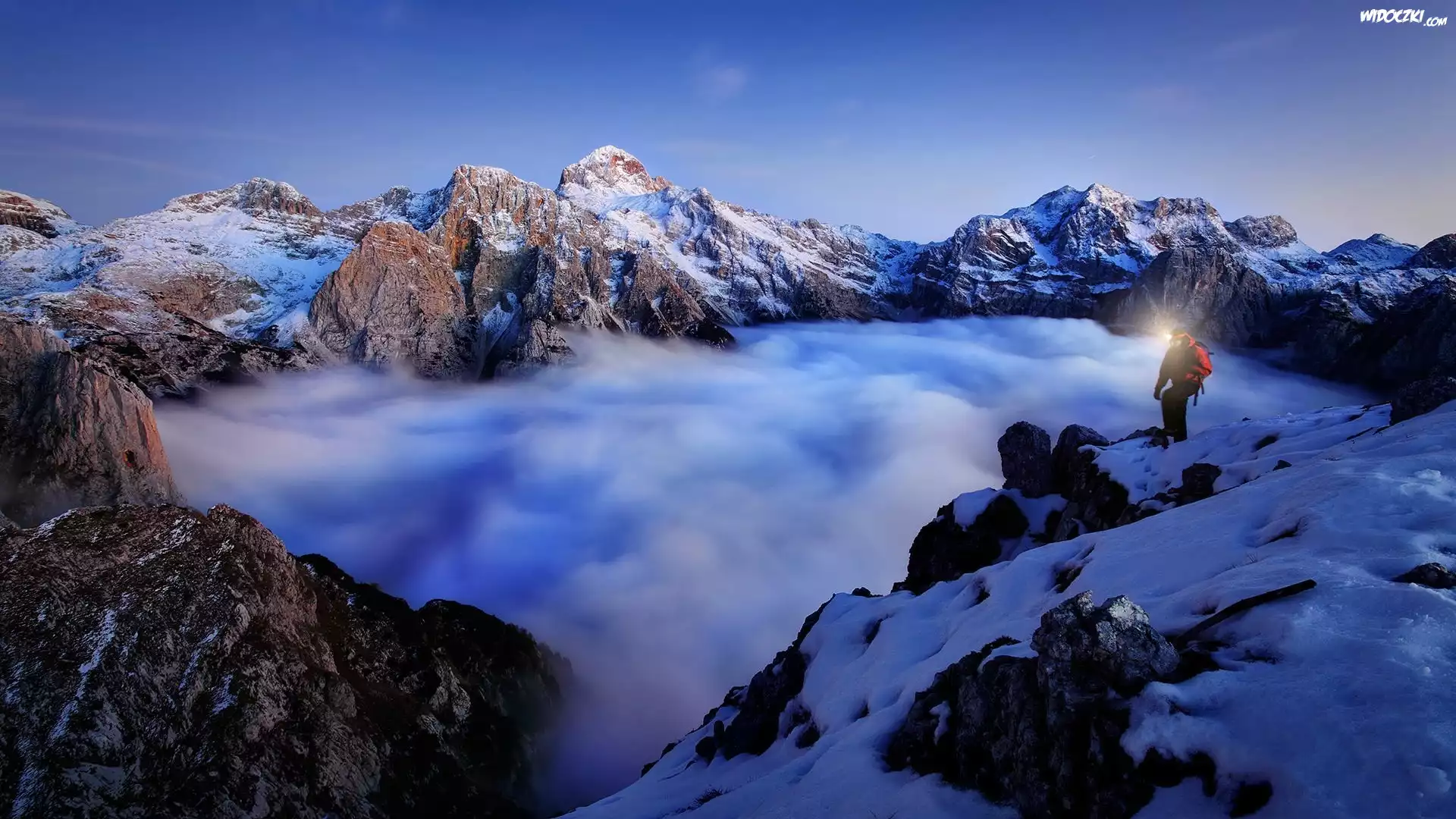 Zdjęcia, Skaliste, Góry, Mężczyzna, Mgła, Ośnieżone, Szczyty
