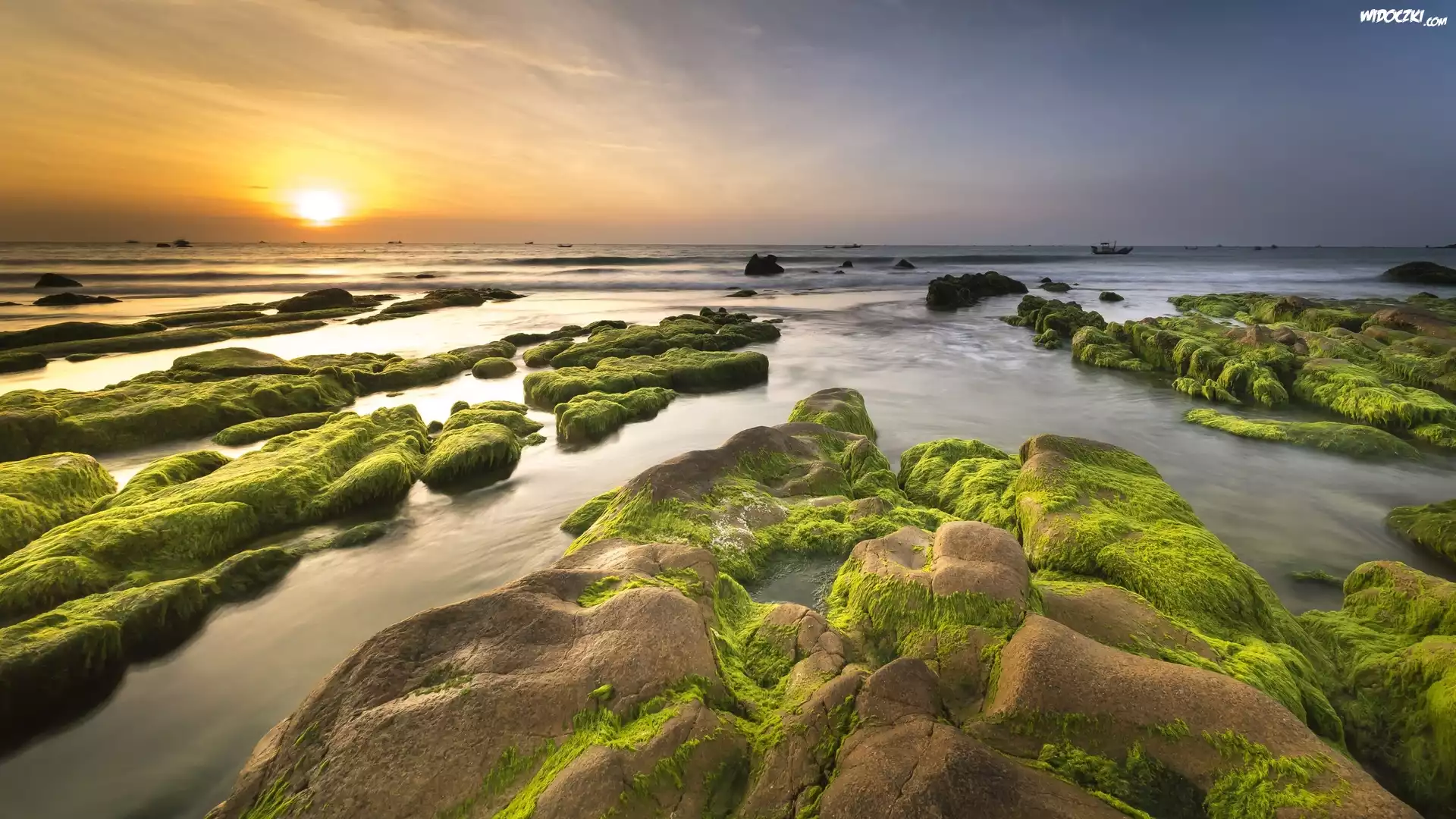 Zdjęcia, Wybrzeże, Skalisty, Brzeg, Omszałe, Skały, Wschód słońca