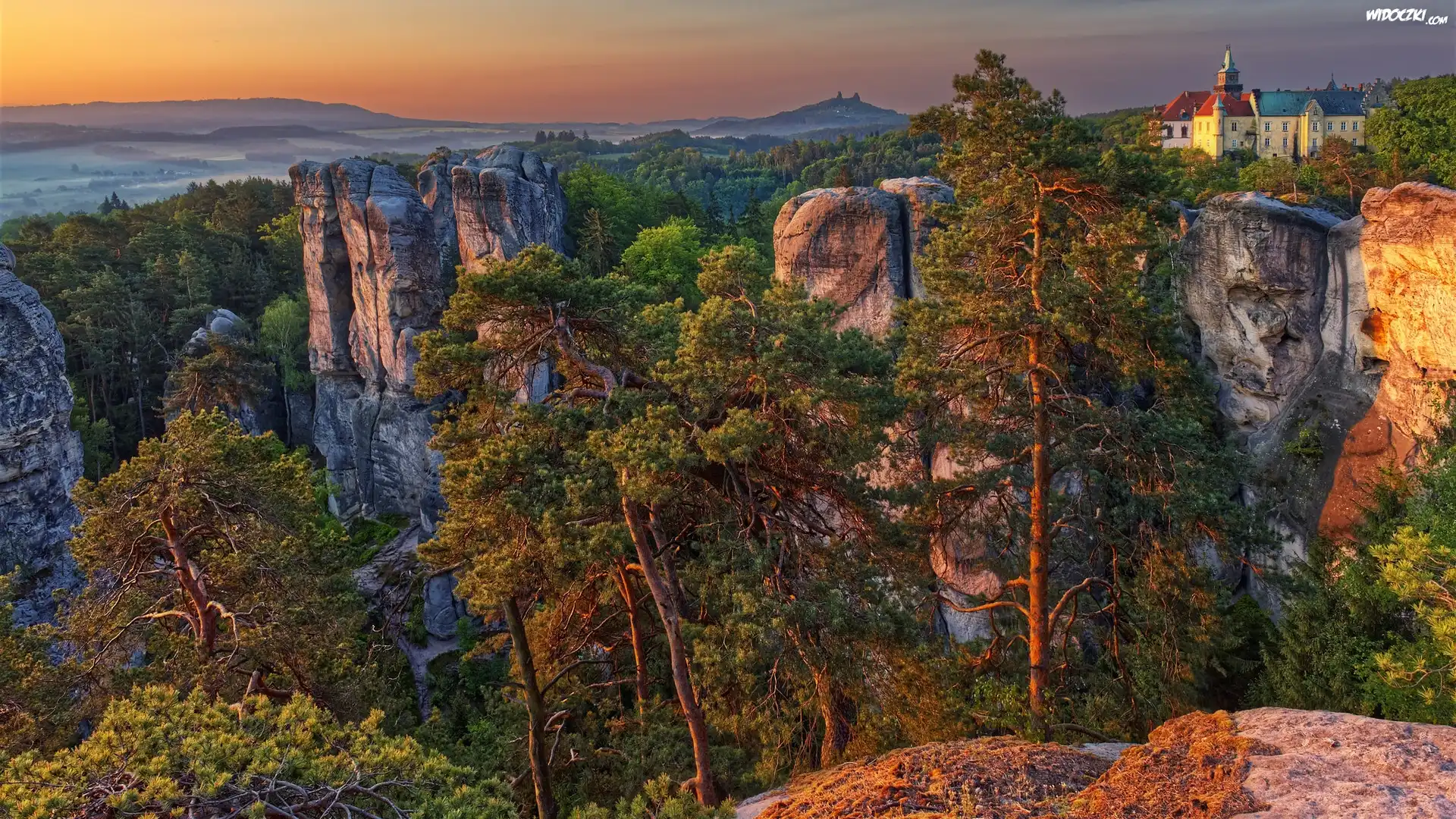 Formacje skalne, Skały, Drzewa, Skalne Miasto, Zamek Hruba Skala, Czeski Raj, Góry Stołowe, Czechy |