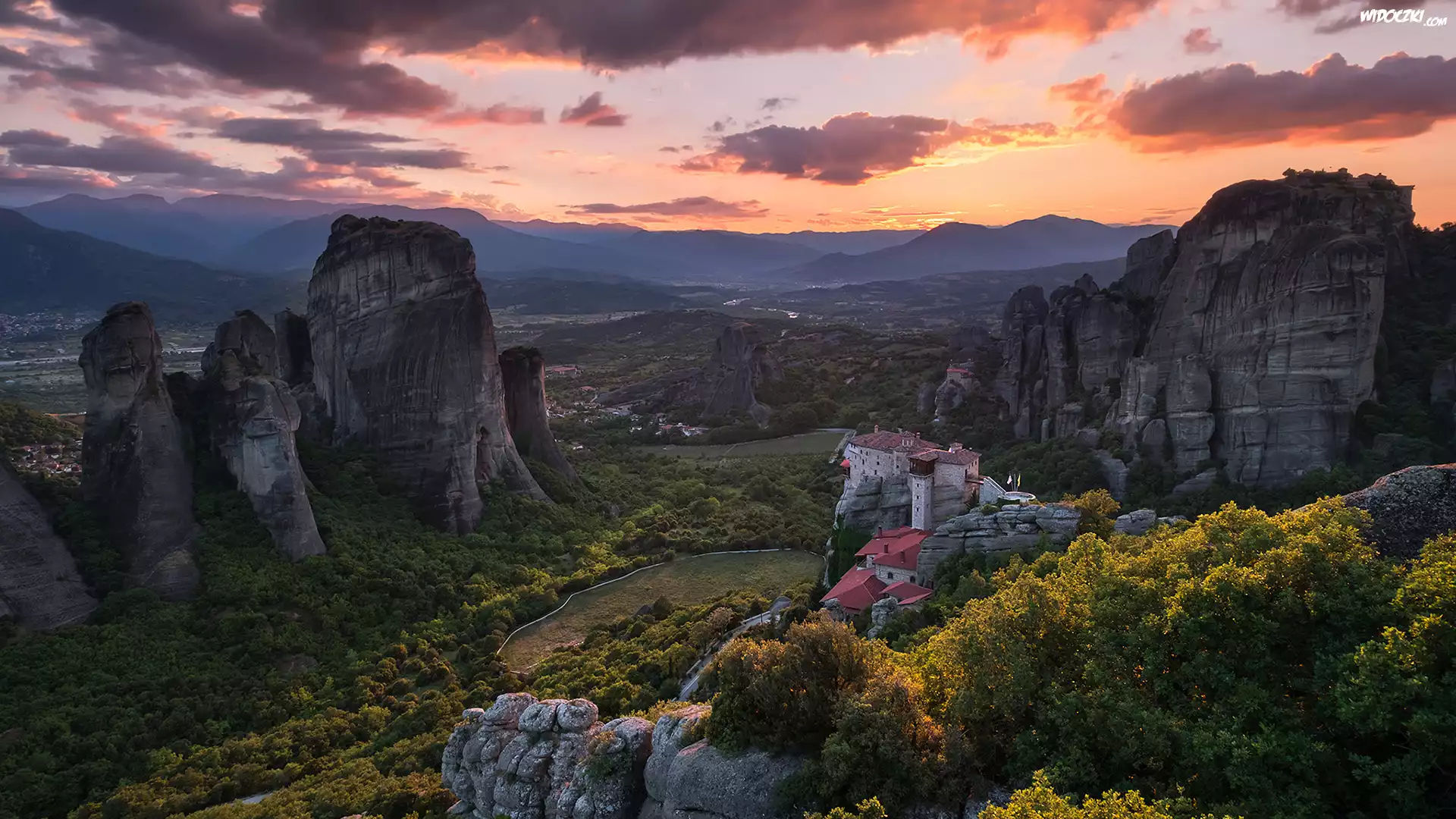 Grecja, Masyw skalny Meteory, Monastyr Varlaam - Klasztor Warłama, Skały, Zachód słońca