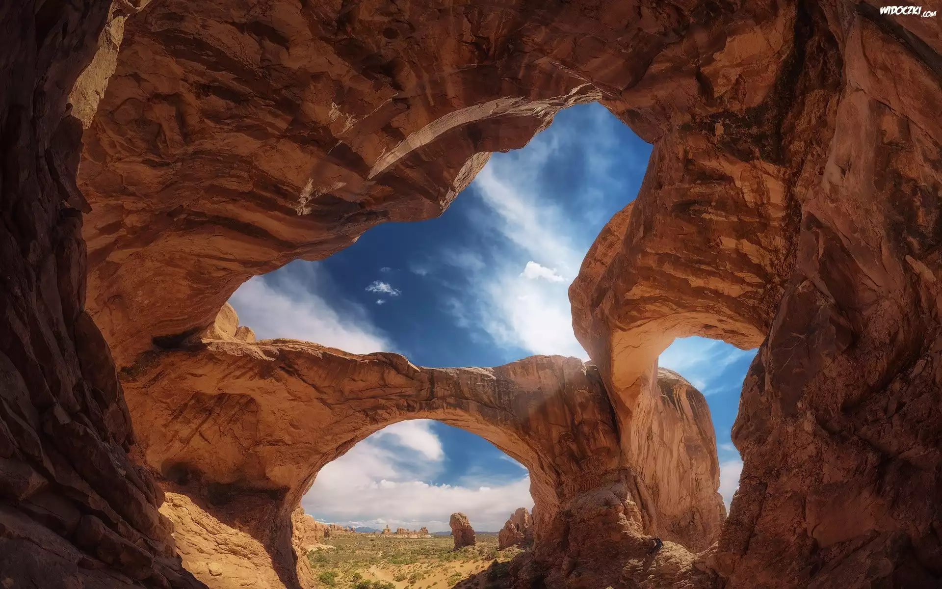 Zdjęcia, Park Narodowy Arches, Skały, Łuk skalny, Double Arch, Stan Utah, Stany Zjednoczone