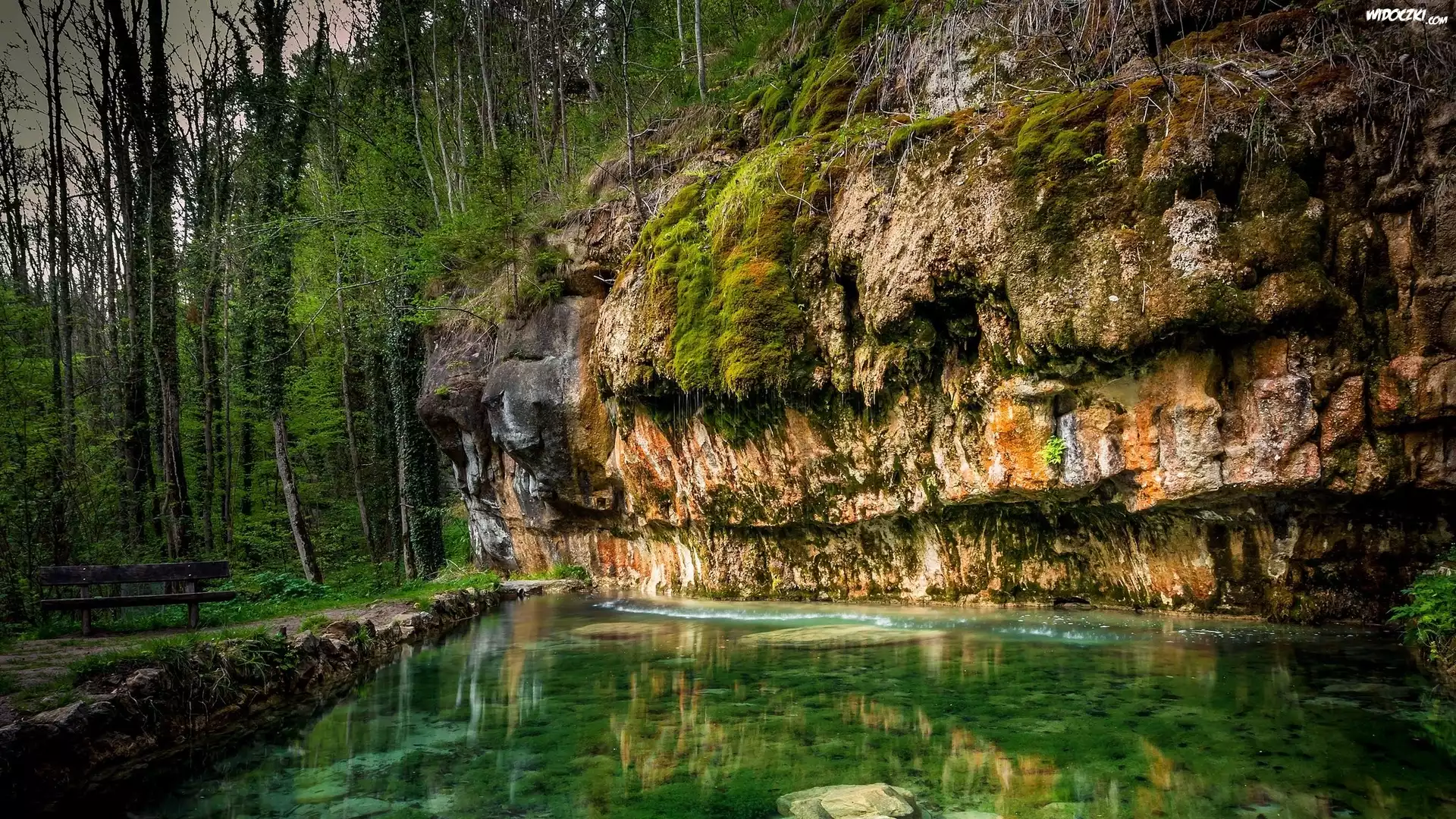 Zdjęcia, Skały, Rzeka, Ławeczka, Drzewa