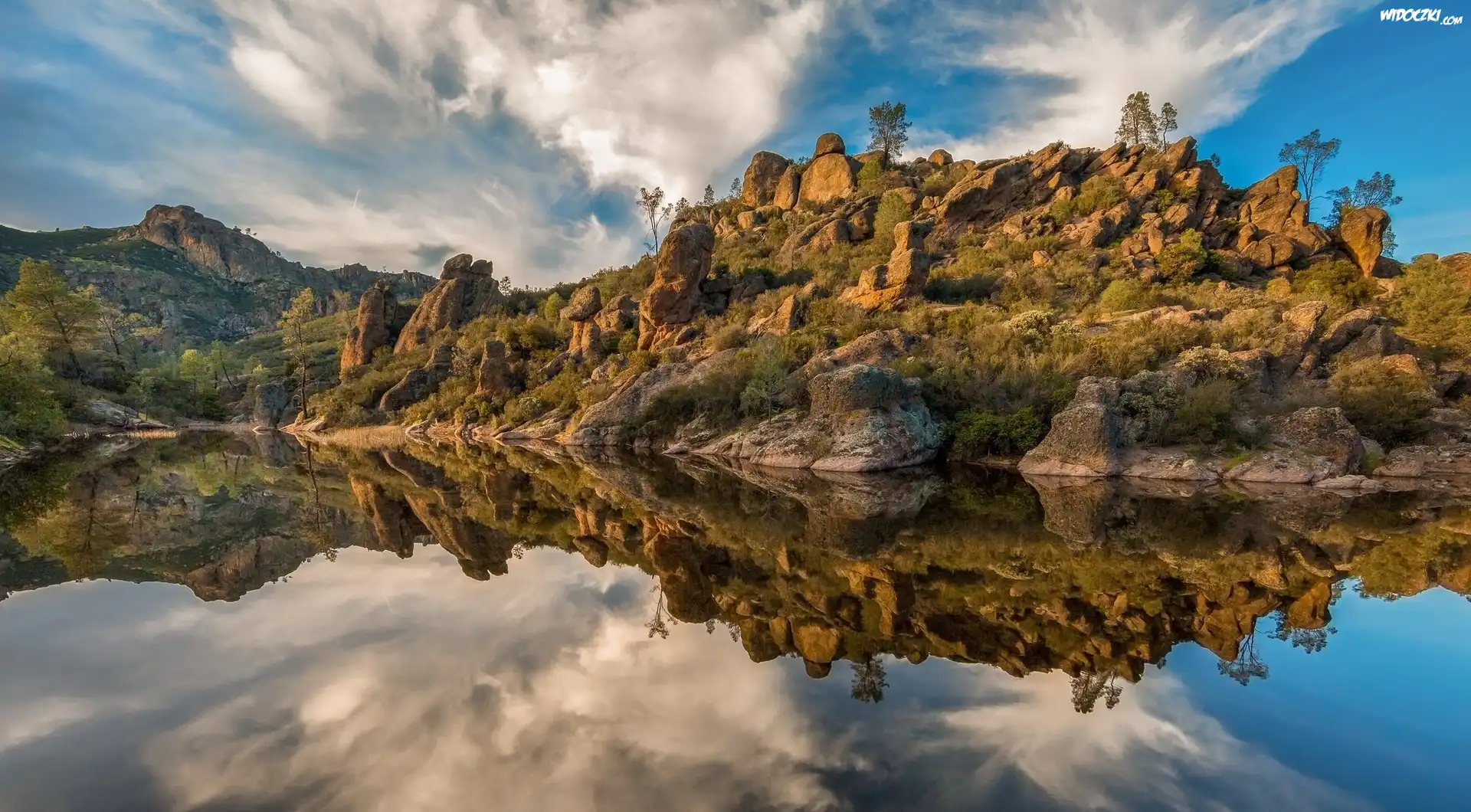 Skały, Kamienie, Jezioro, Chmury, Odbicie