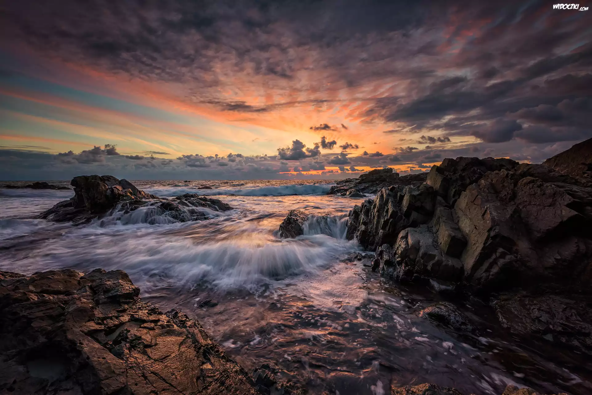 Zdjęcia, Morze Czarne, Skały, Fale, Chmury, Zachód słońca, Rezowo, Gmina Carewo, Bułgaria