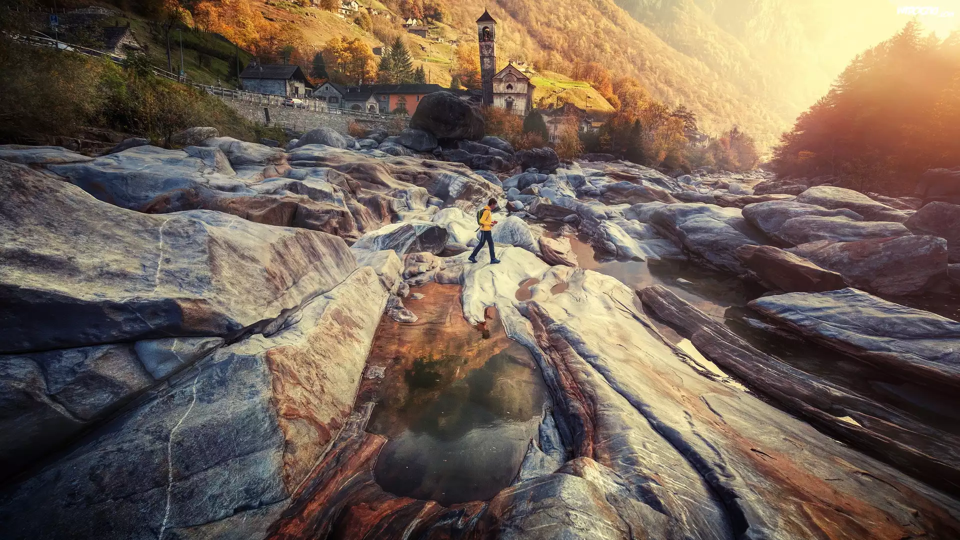 Kościół, Skały, Mężczyzna, Rzeka, Kamienie, Wzgórza, Drzewa, Domy