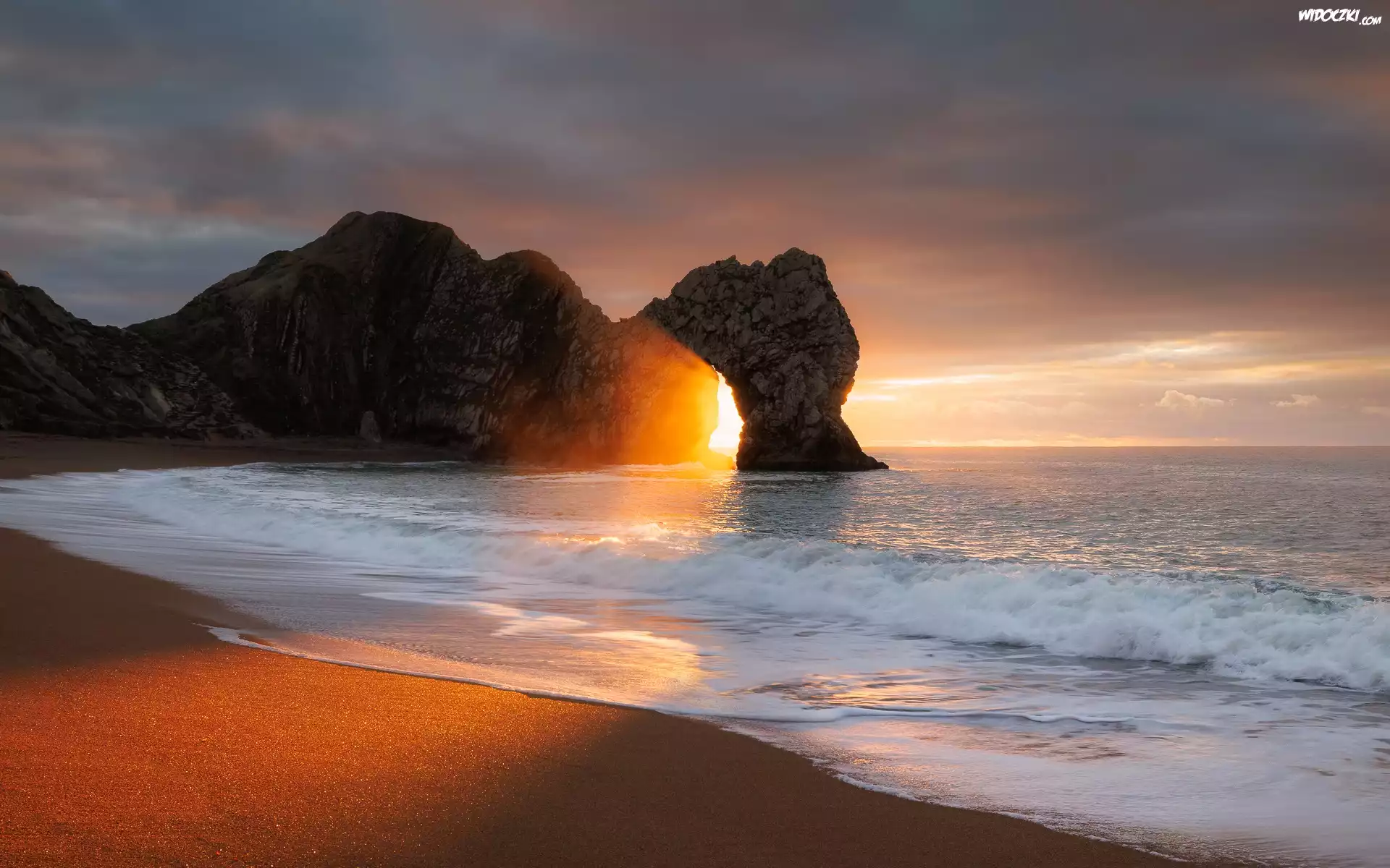 Anglia, Hrabstwo Dorset, Plaża, Morze, Wybrzeże Jurajskie, Skały, Łuk wapienny, Durdle Door, Chmury, Zachód słońca |