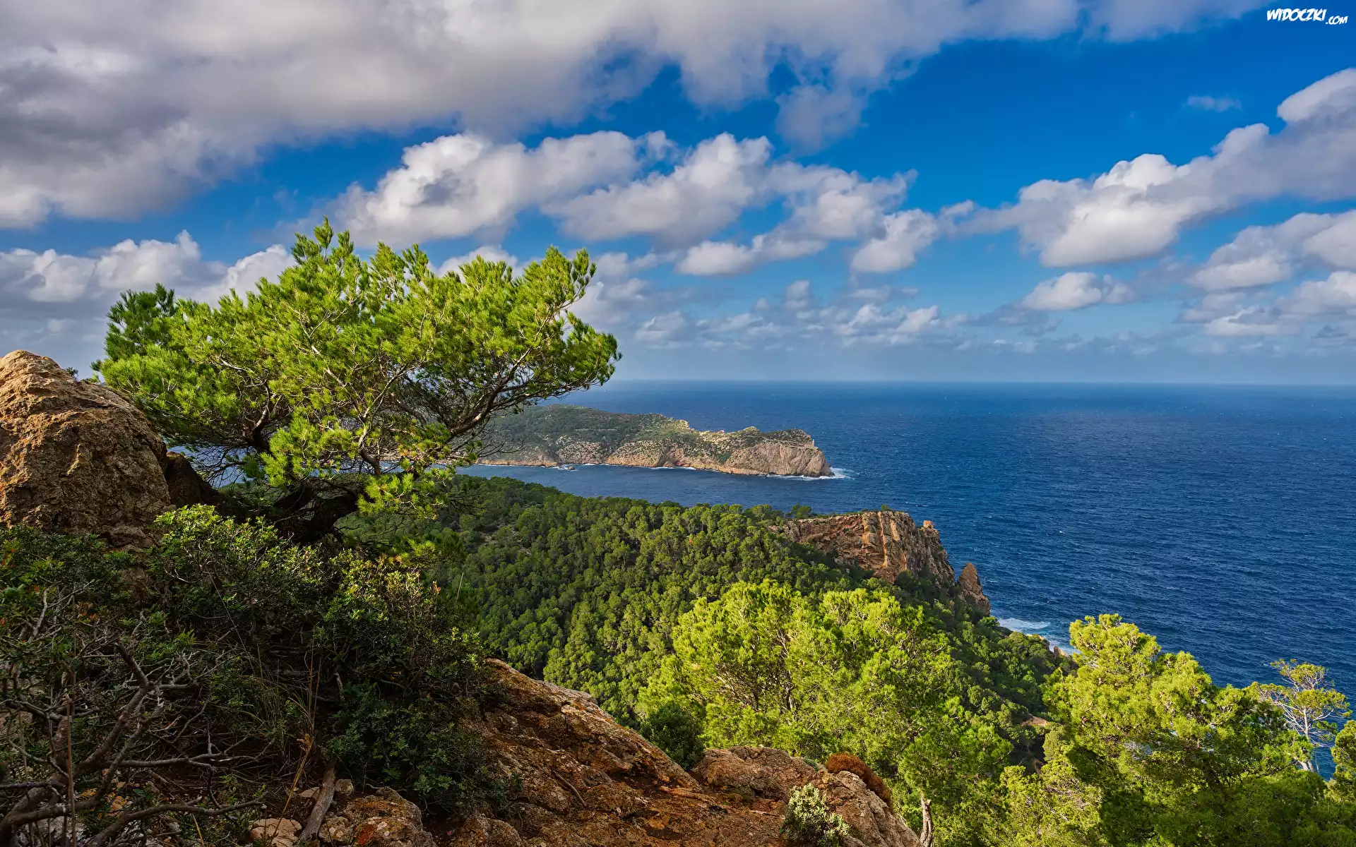 Zdjęcia, Hiszpania, Majorka, Andratx, Morze, Skały, Drzewa, Roślinność, Chmury