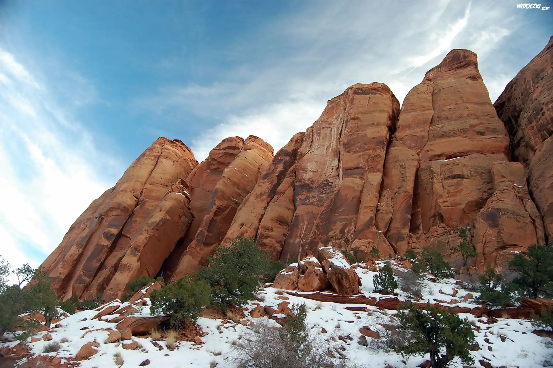 Zdjęcia, Skały, Śnieg, Drzewa, Chmury