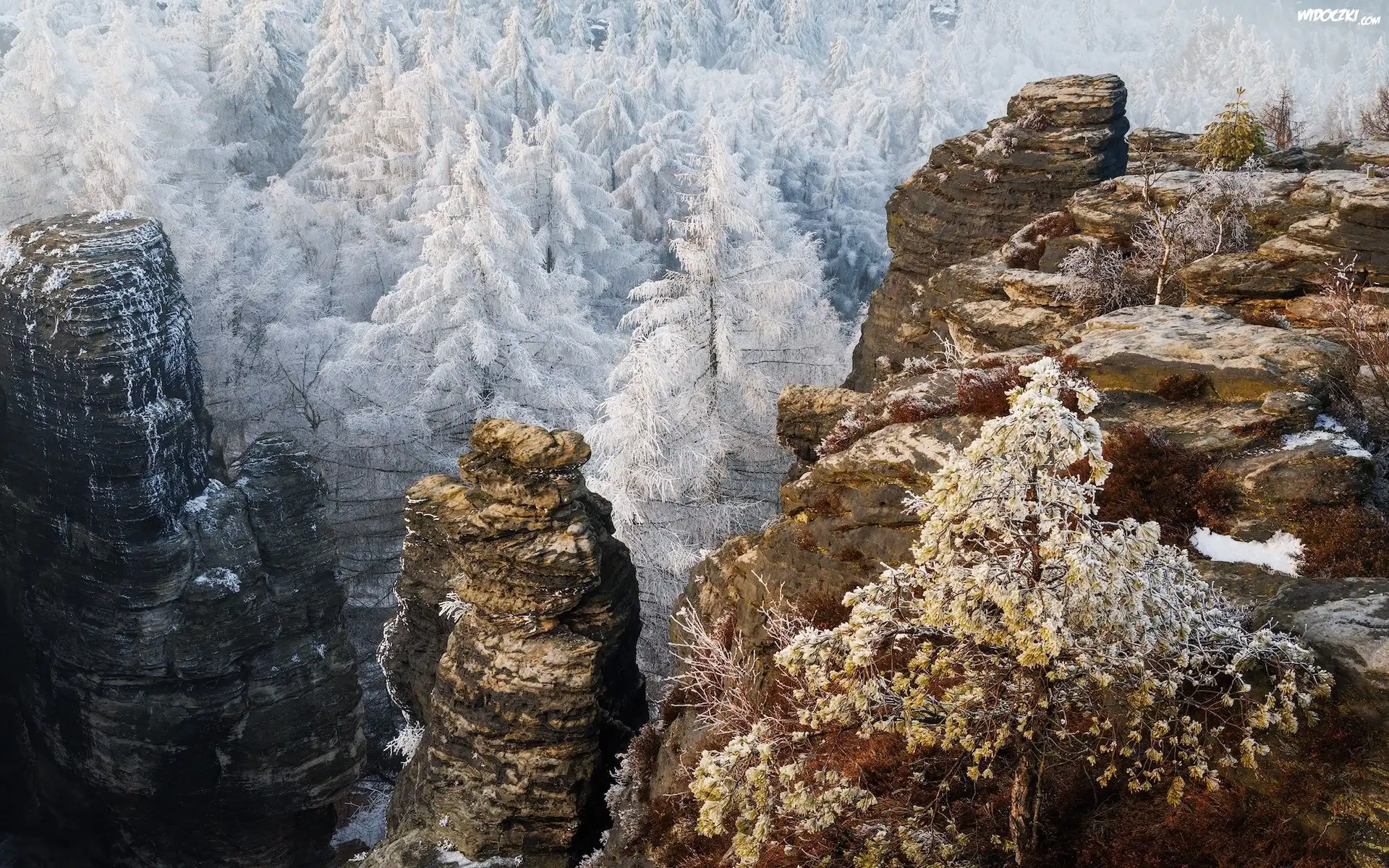 Zima, Góry Połabskie, Skały, Ośnieżone, Drzewa