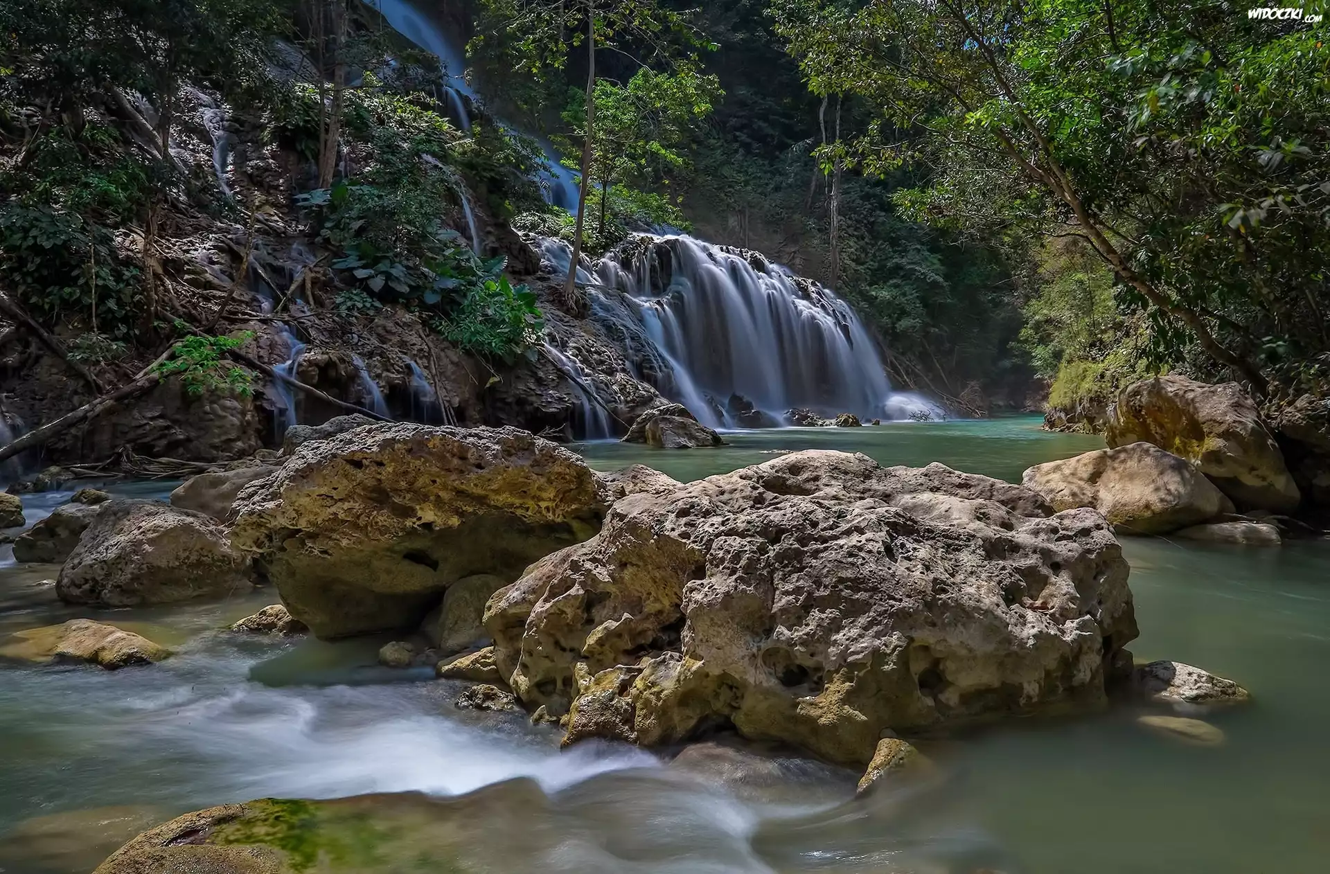Zdjęcia, Skały, Wodospad, Drzewa, Rzeka
