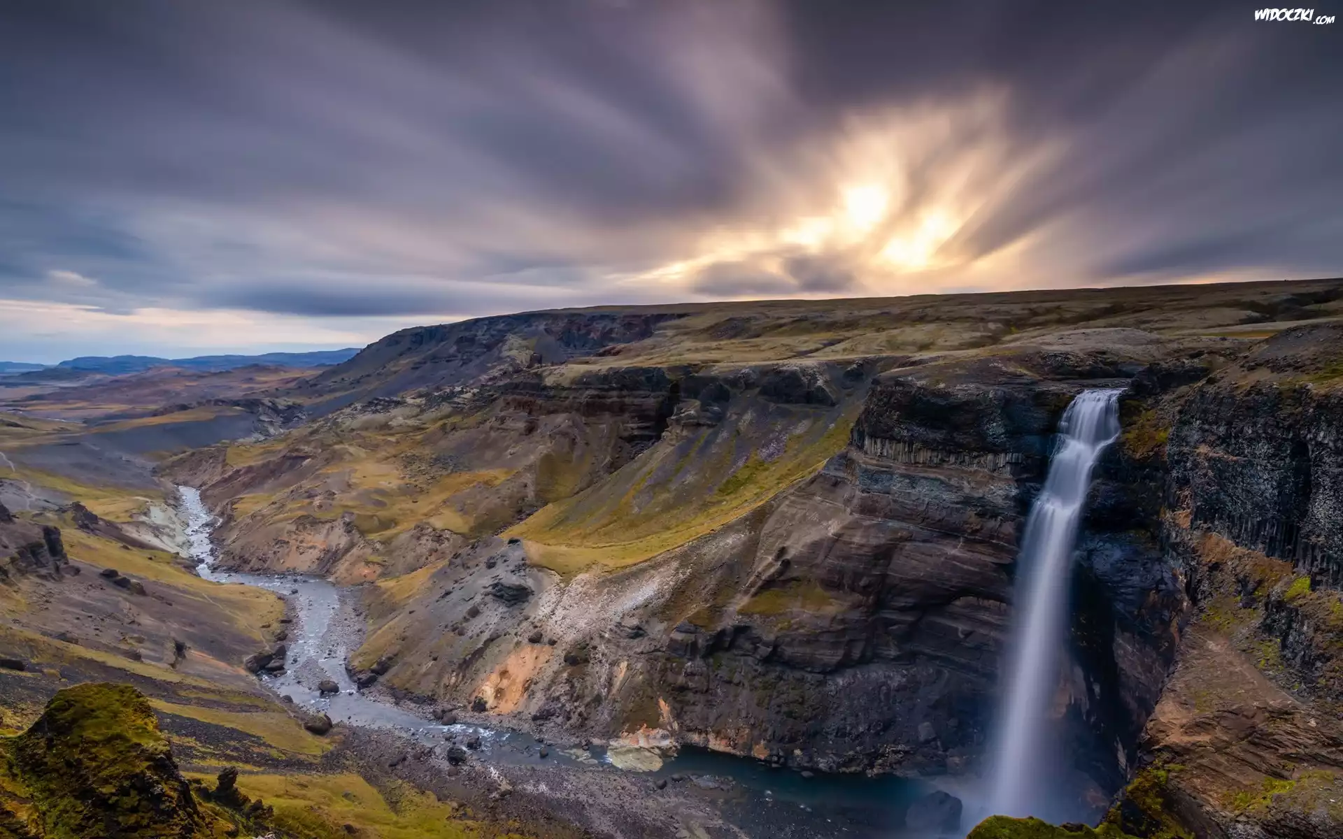 Islandia, Rzeka Fossa, Wodospad Haifoss, Chmury, Góry, Skały