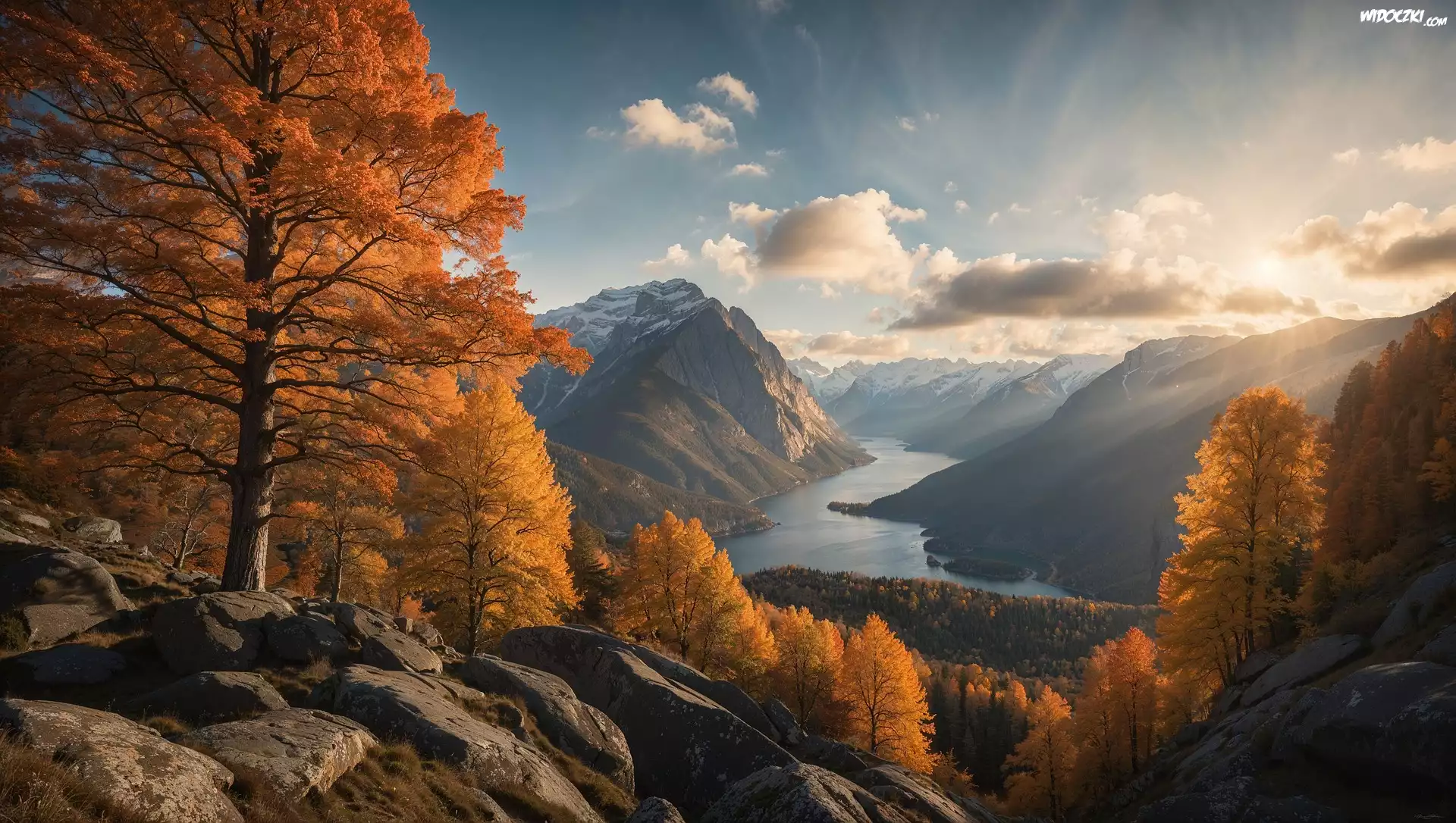 Zdjęcia, Jesień, Pożółkłe, Drzewa, Skały, Rzeka, Góry