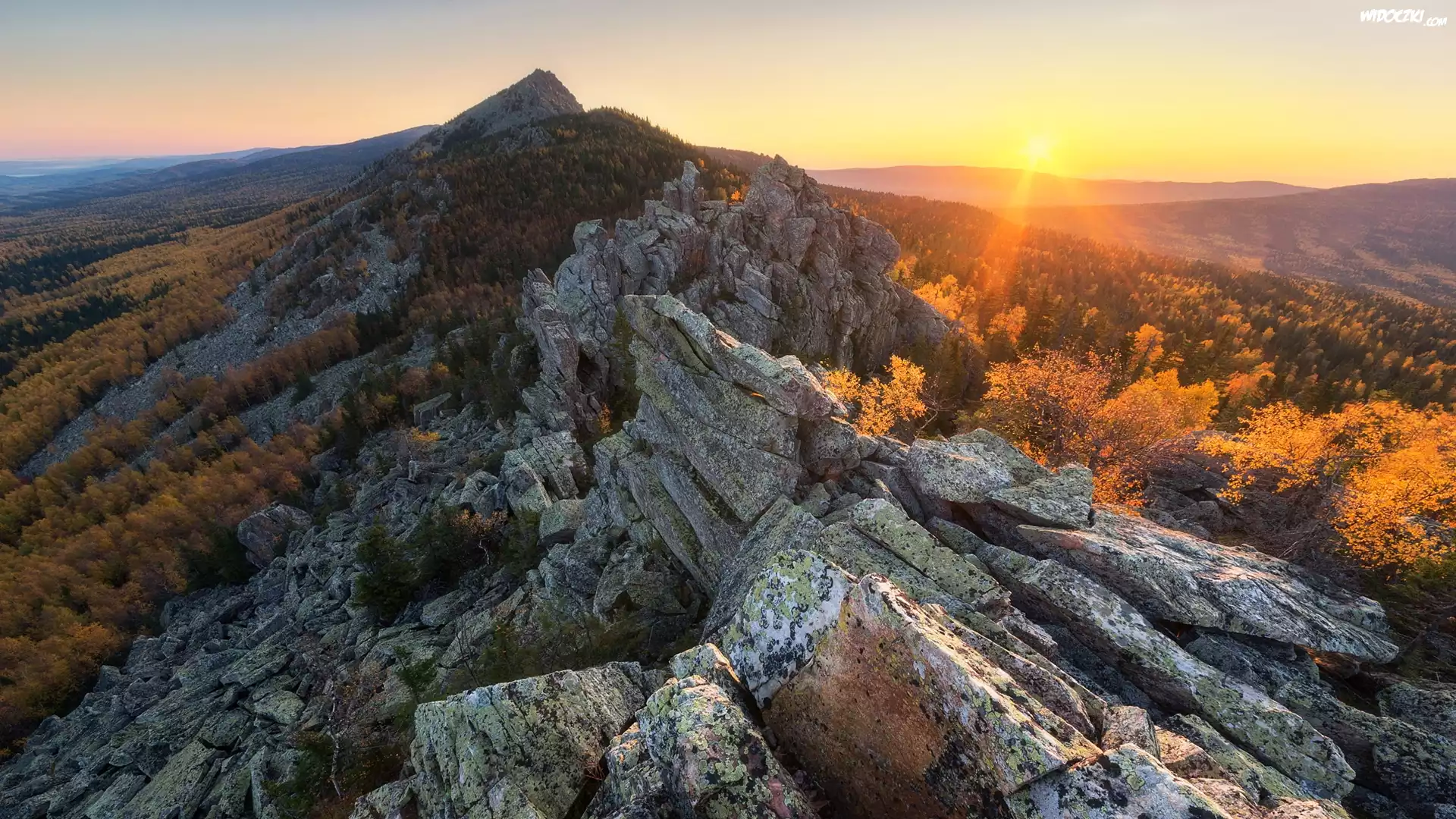 Zdjęcia, Góry, Skały, Las, Drzewa, Promienie słońca, Jesień